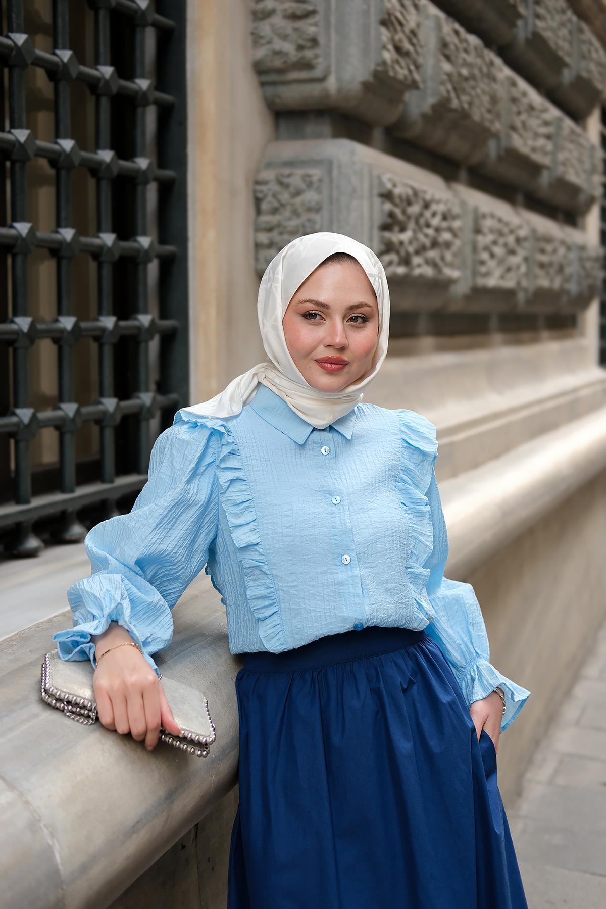 Önü Fırfır Detaylı Keten Gömlek Bebe Mavi