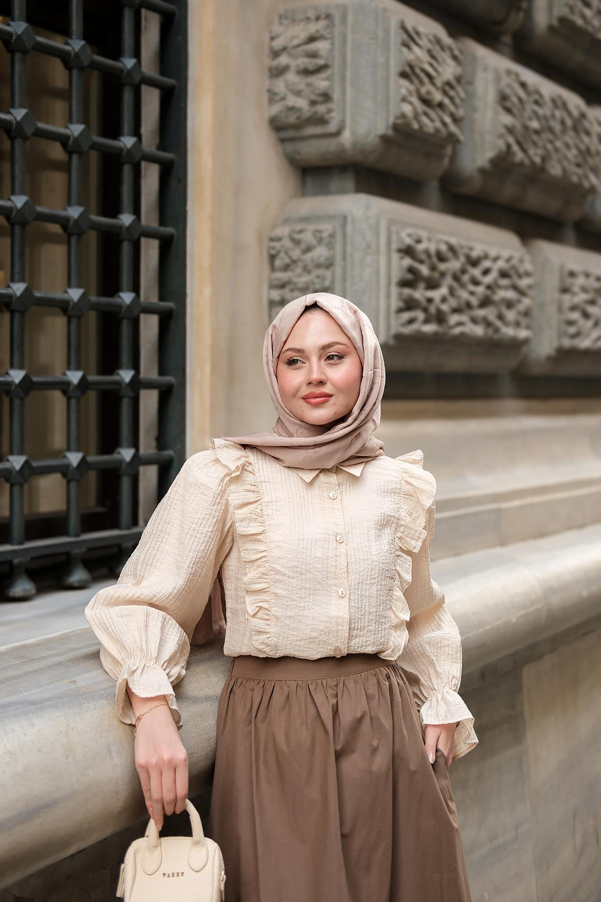 Önü Fırfır Detaylı Keten Gömlek Krem