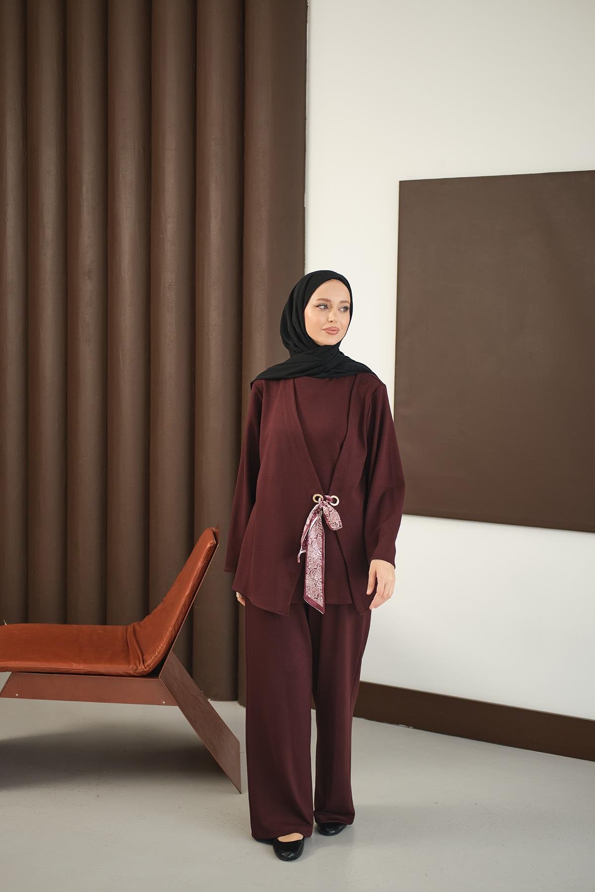 Önü Fular Detay Takım Bordo