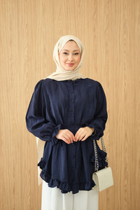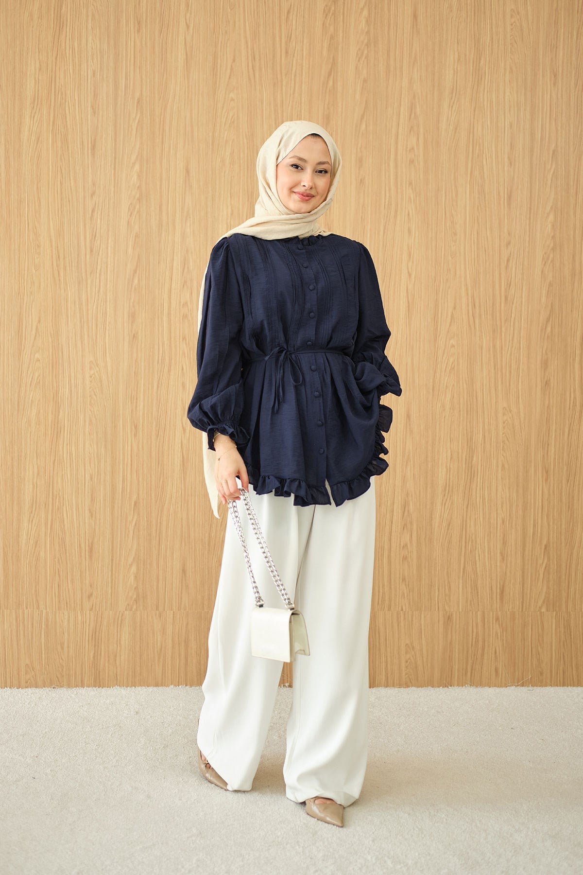 Önü Nervurlu Bel Bağlamalı Gömlek Lacivert