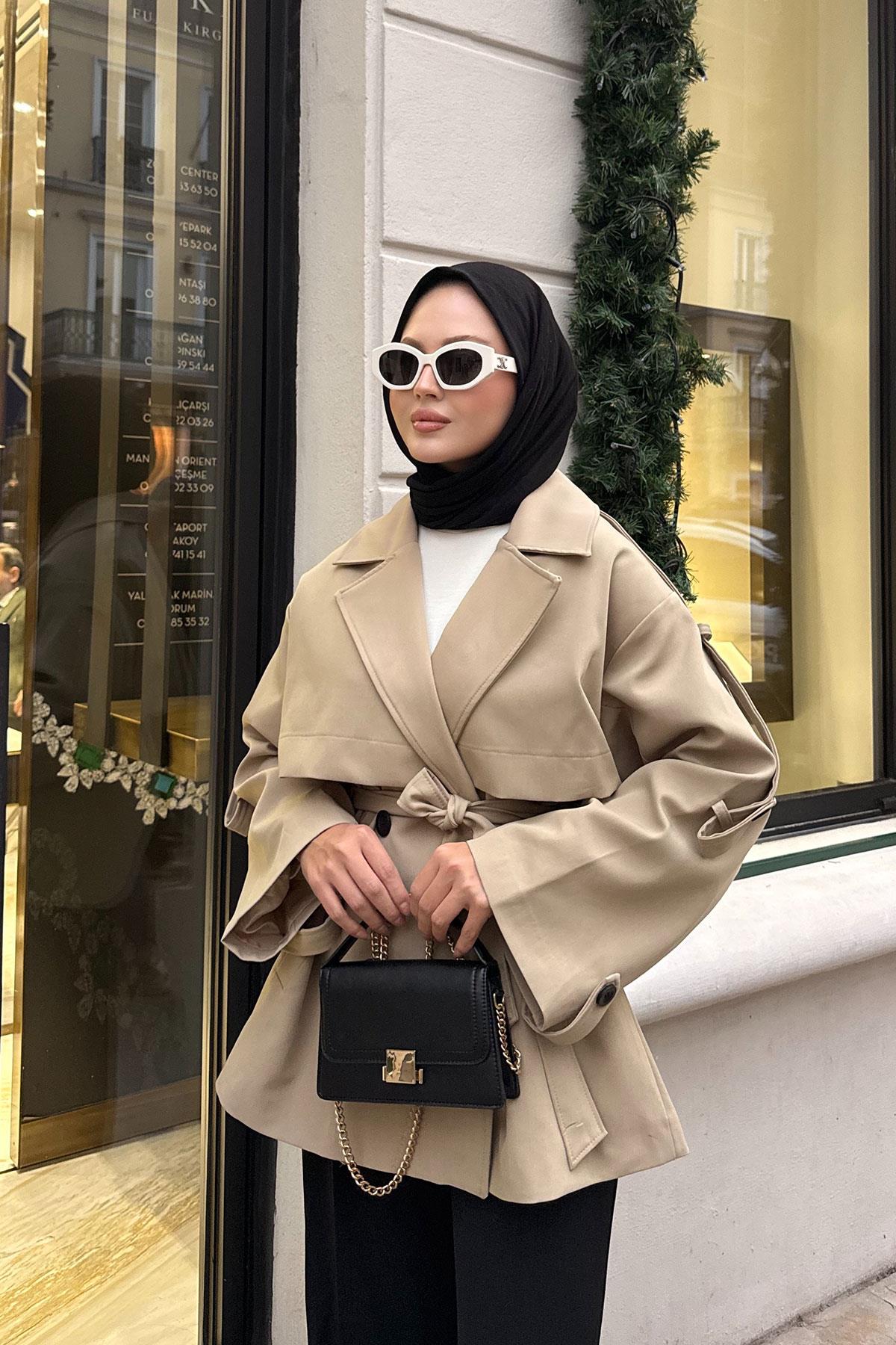 Önü Parça Detaylı Kısa Trenç Vizon