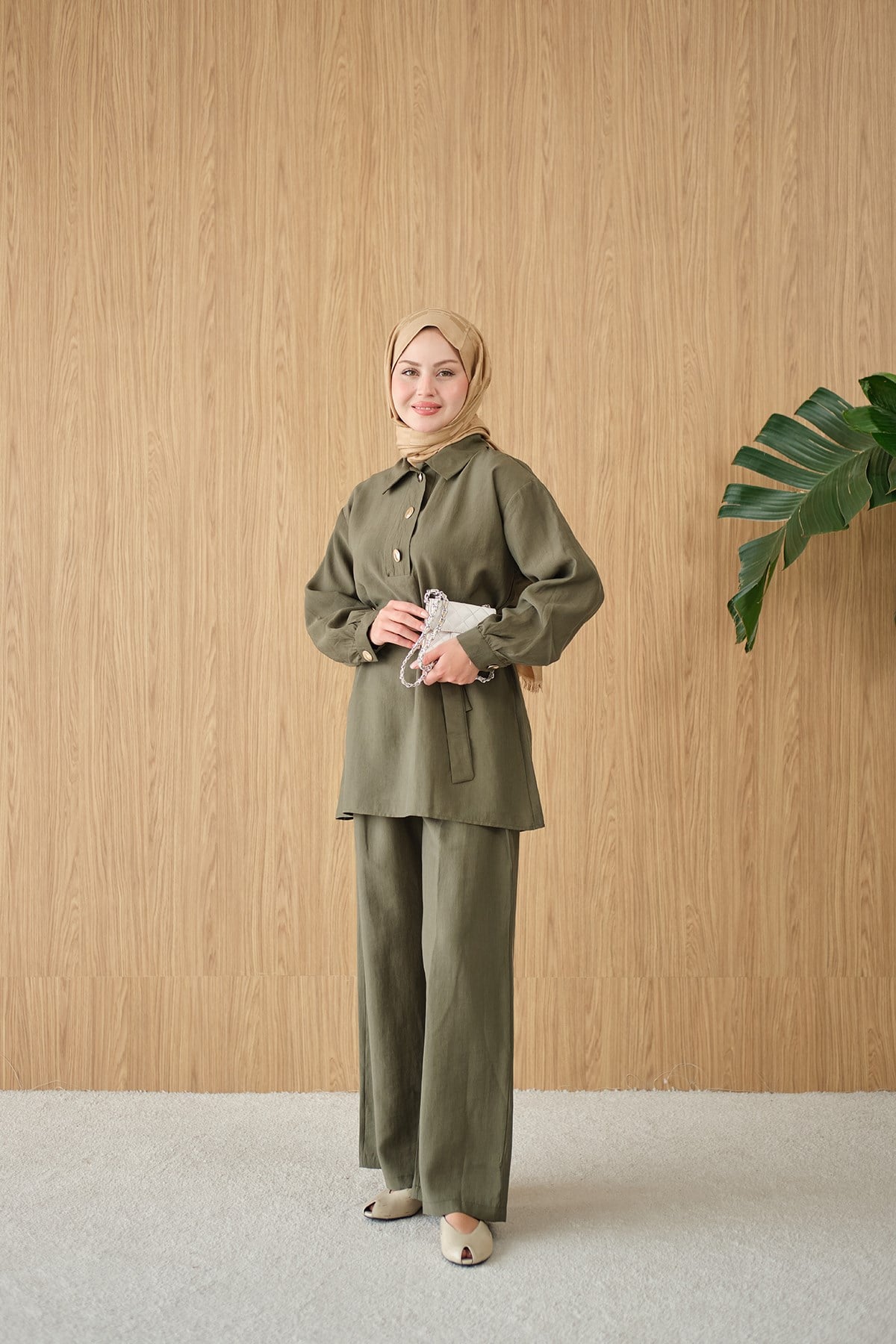 Önü Pat Düğme Detay Gömlek Yaka Takım Haki Yeşil