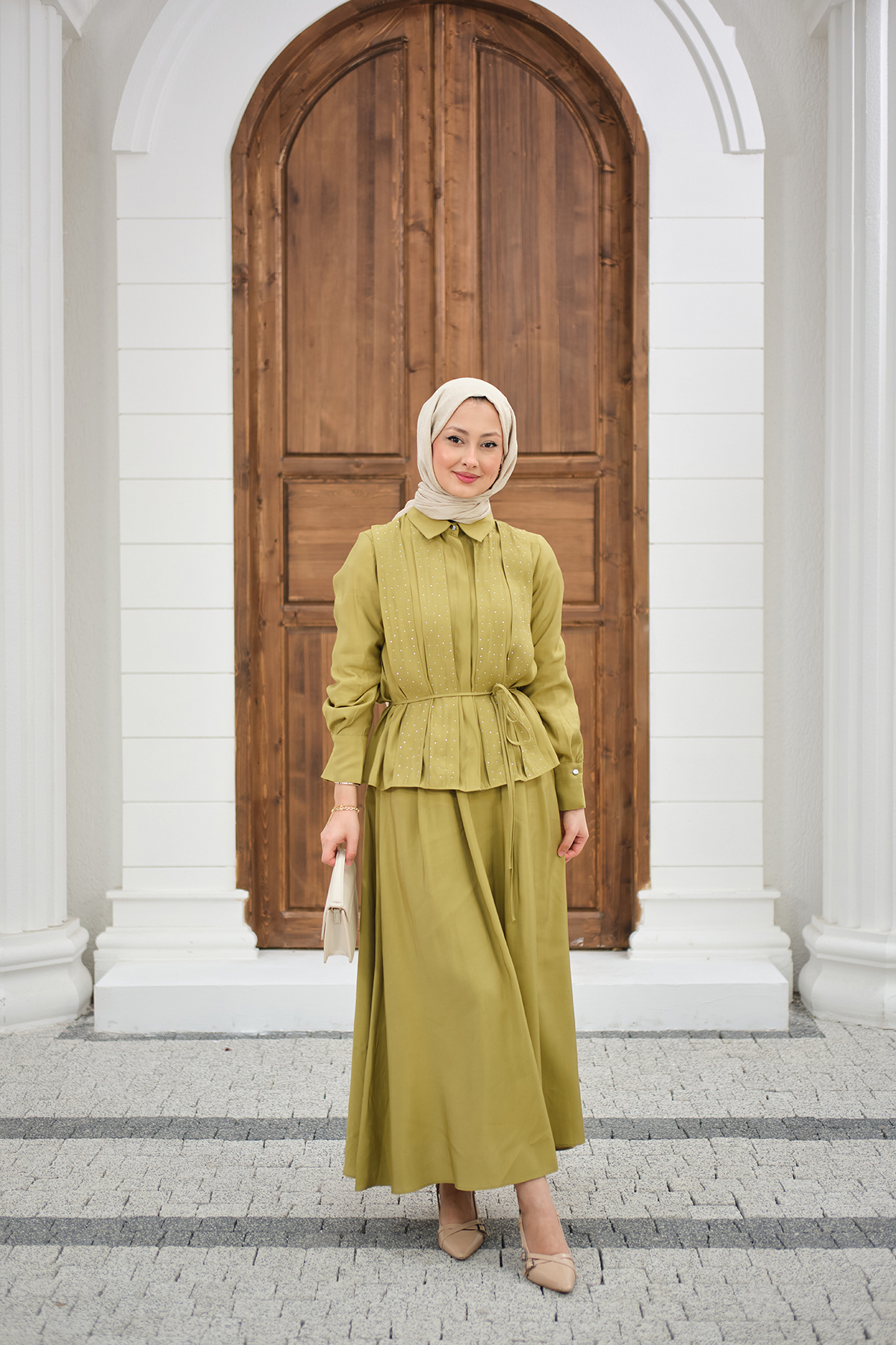 Önü Taş Detay Gizli Düğmeli Bel Bağlamalı Etekli Takım Yağ Yeşil