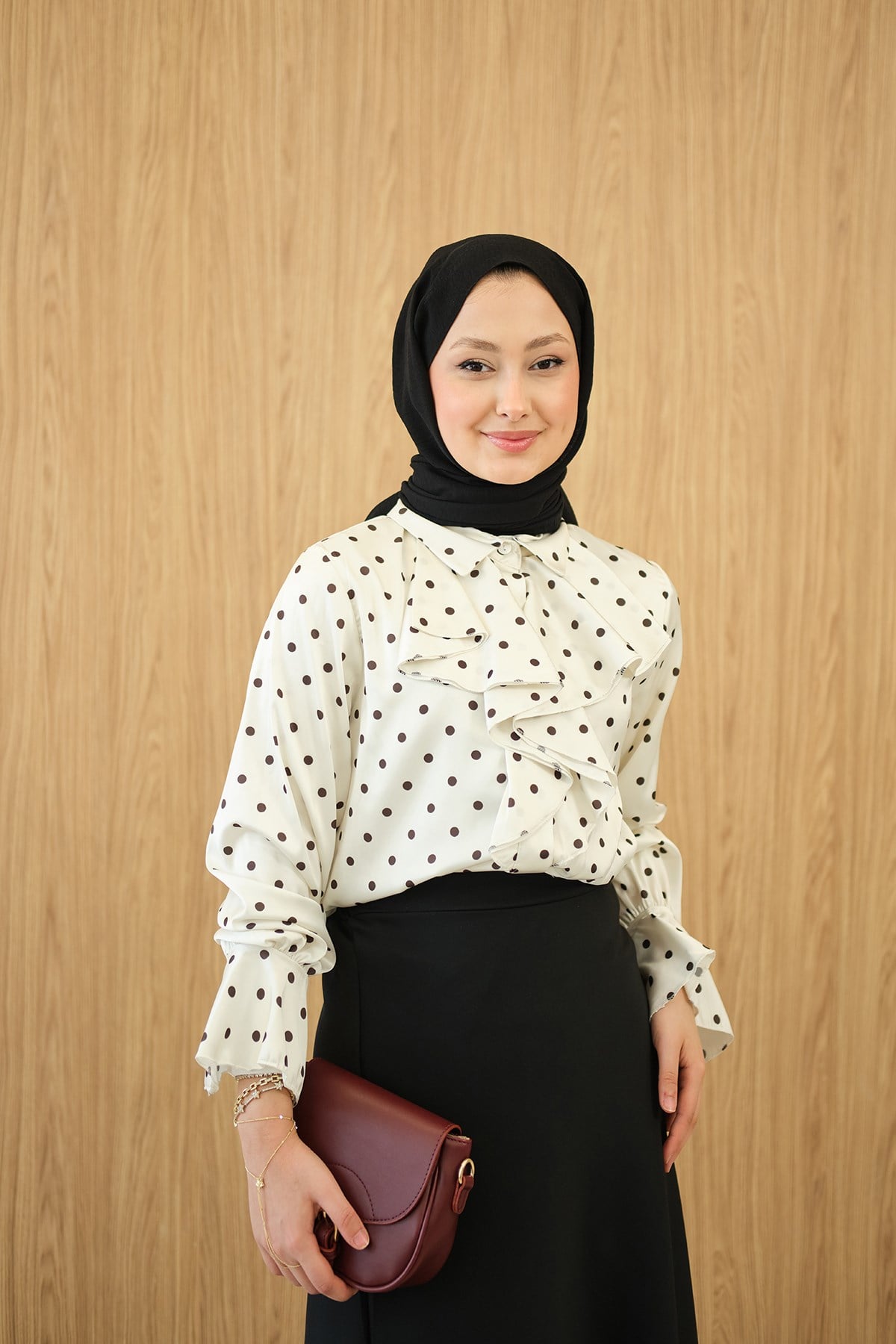 Önü Volanlı Puantiyeli Gömlek Beyaz