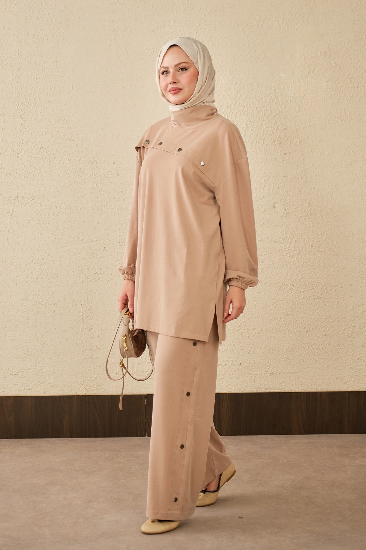 Önü Yan Çıtçıt Detay Dik Yaka Takım Vizon