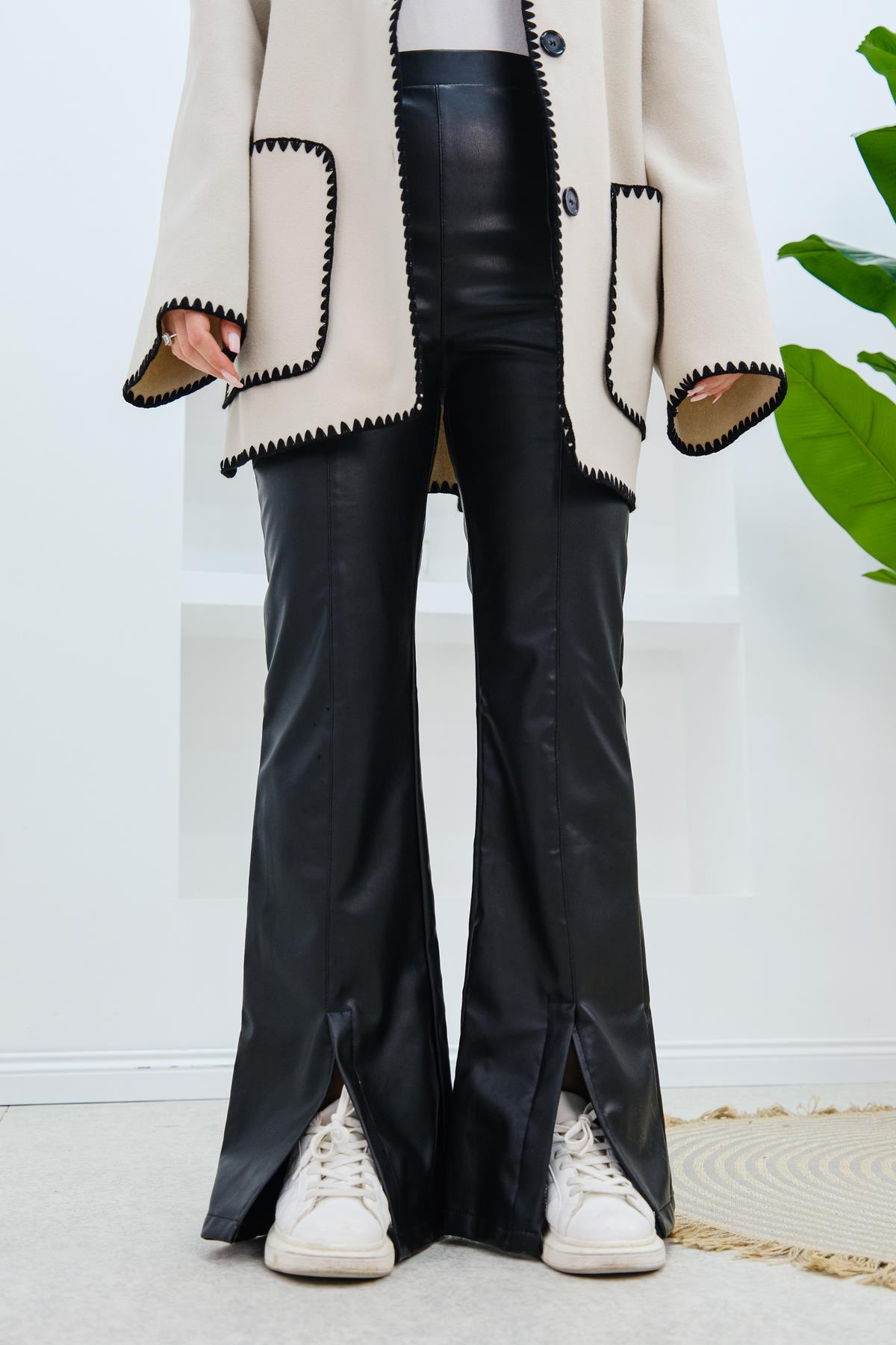 Paça Detayı Yırtmaçlı Deri Pantolon Siyah