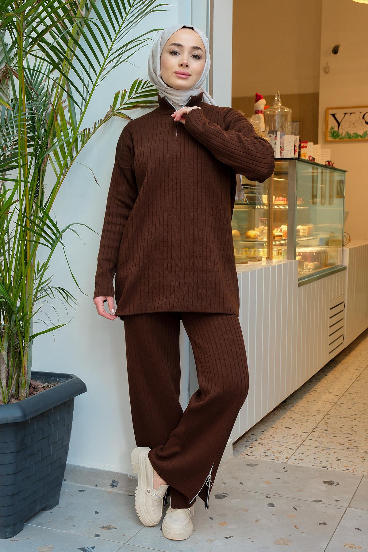 Paçası Fermuarlı İkili Triko Takım Acı Kahve