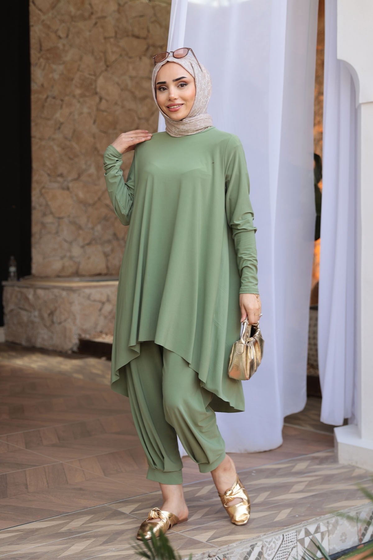 Paçası Lastik Detaylı Takım Yeşil
