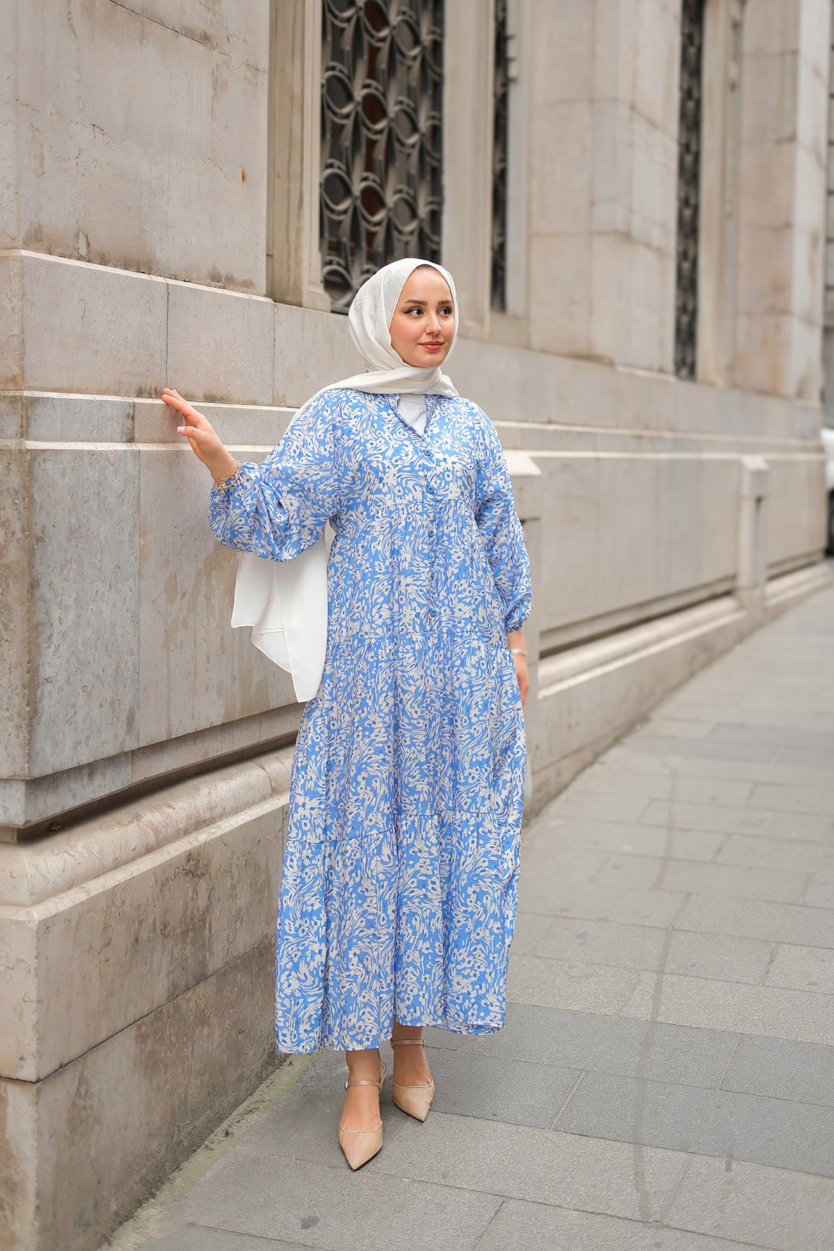 Papatya Desenli Elbise Mavi