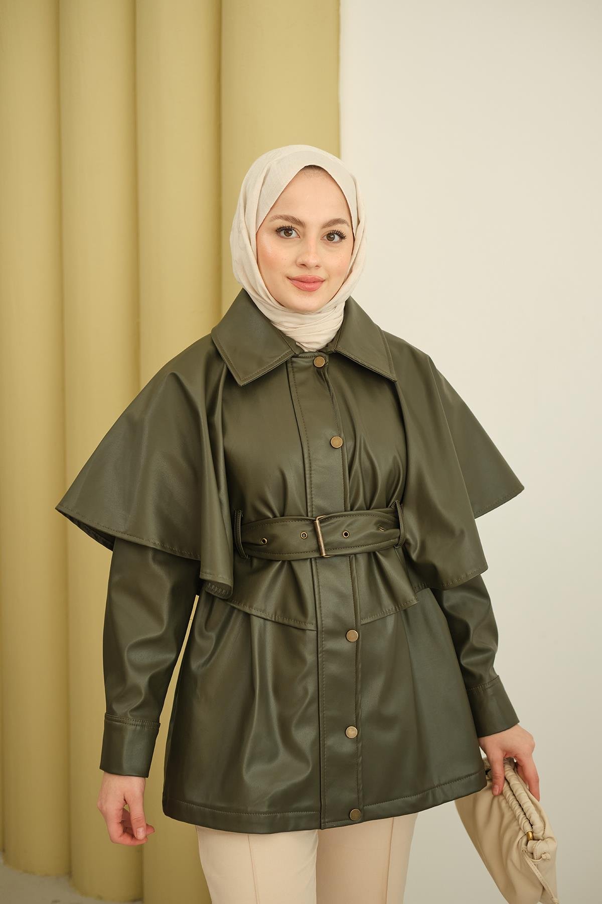 Pelerin Detay Kemerli Deri Trenç Haki Yeşil
