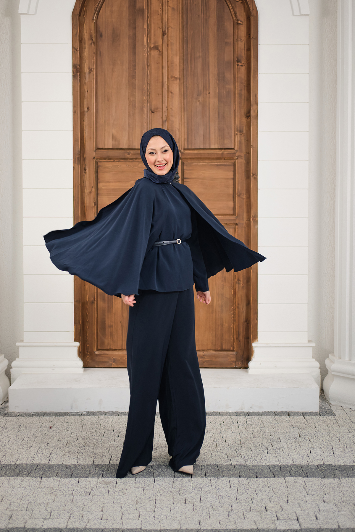 Pelerin Kol Arkası Fermuarlı Kemer Detay Takım Lacivert