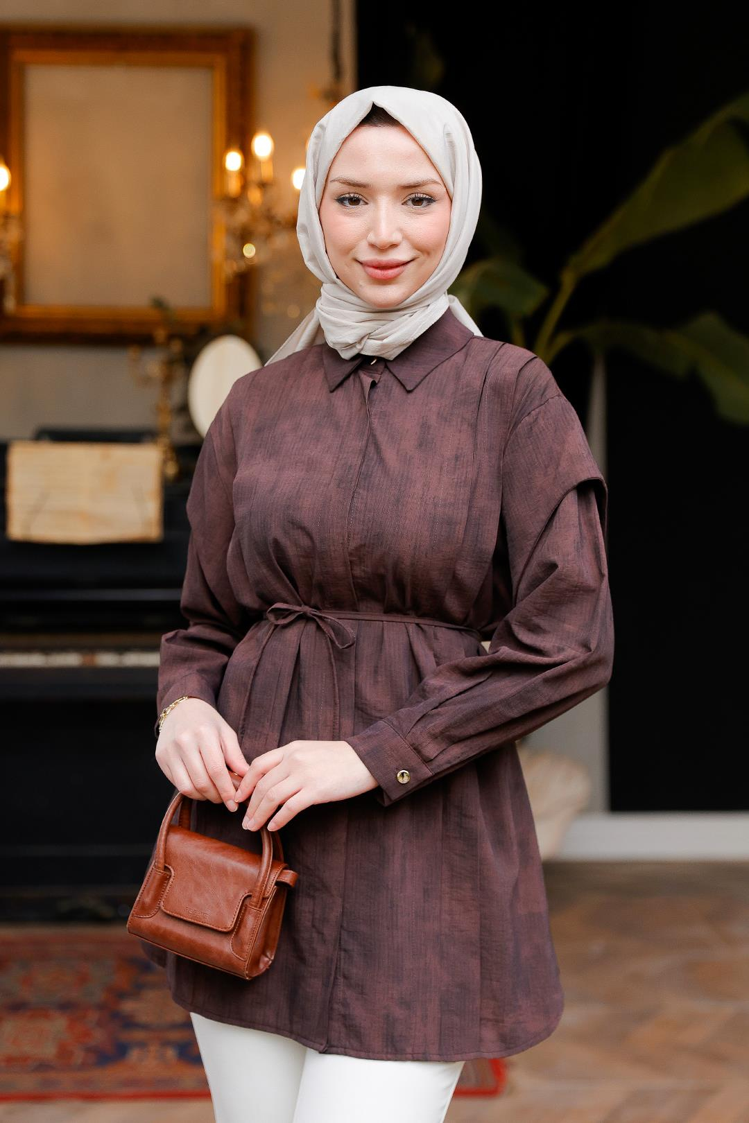 Pelerin Kol Gizli Düğmeli Gömlek Kahverengi