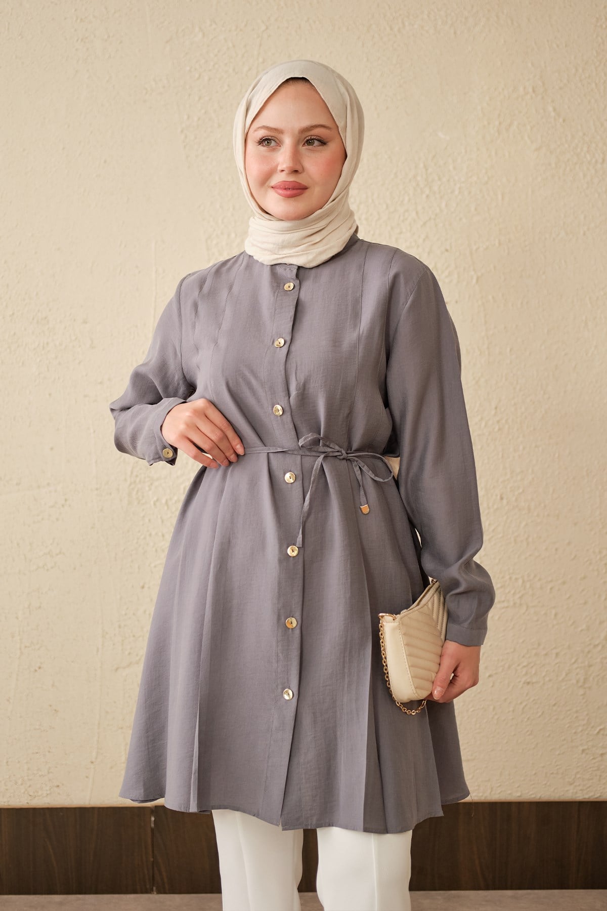 Pile Detay Bel Bağlamalı Uzun Gömlek Gri