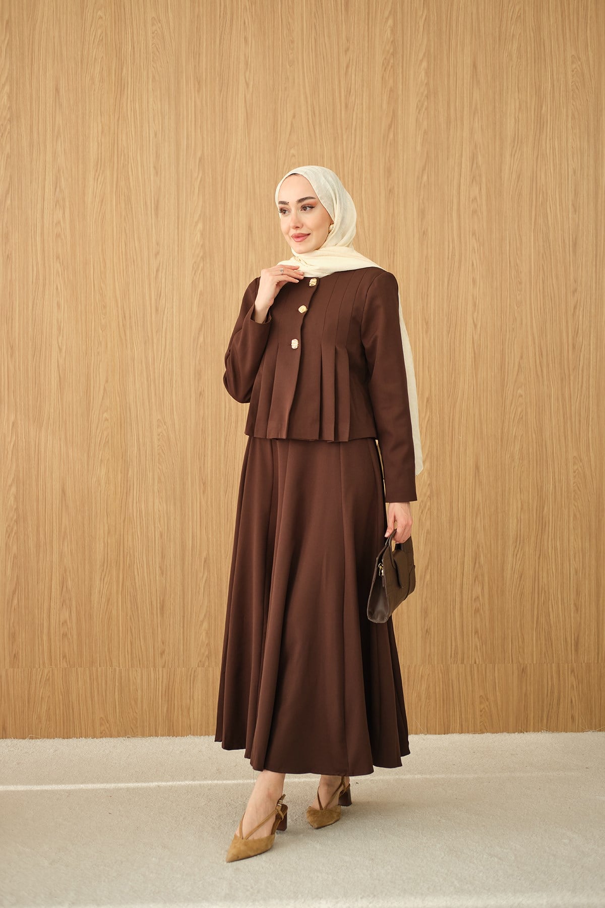 Pile Detaylı Gold Düğme Detay Etekli Takım Kahverengi