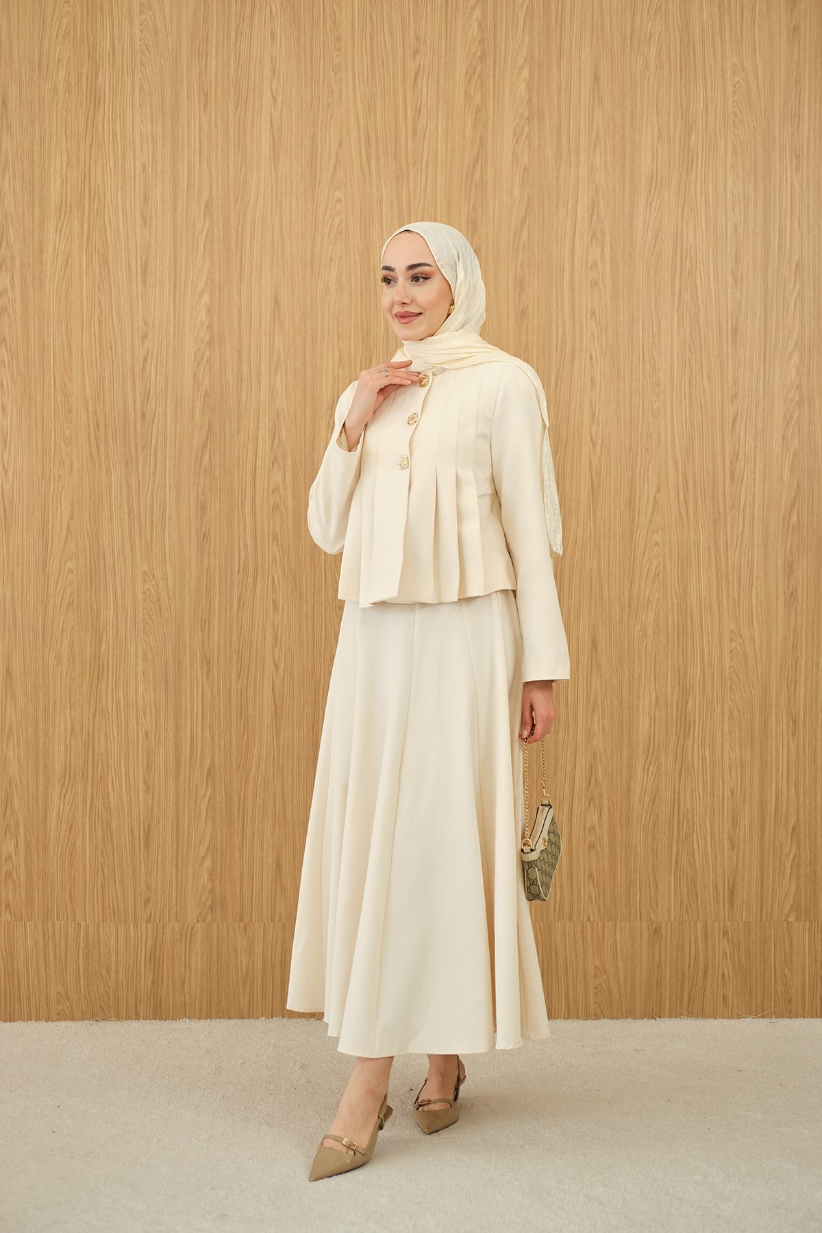 Pile Detaylı Gold Düğme Detay Etekli Takım Krem