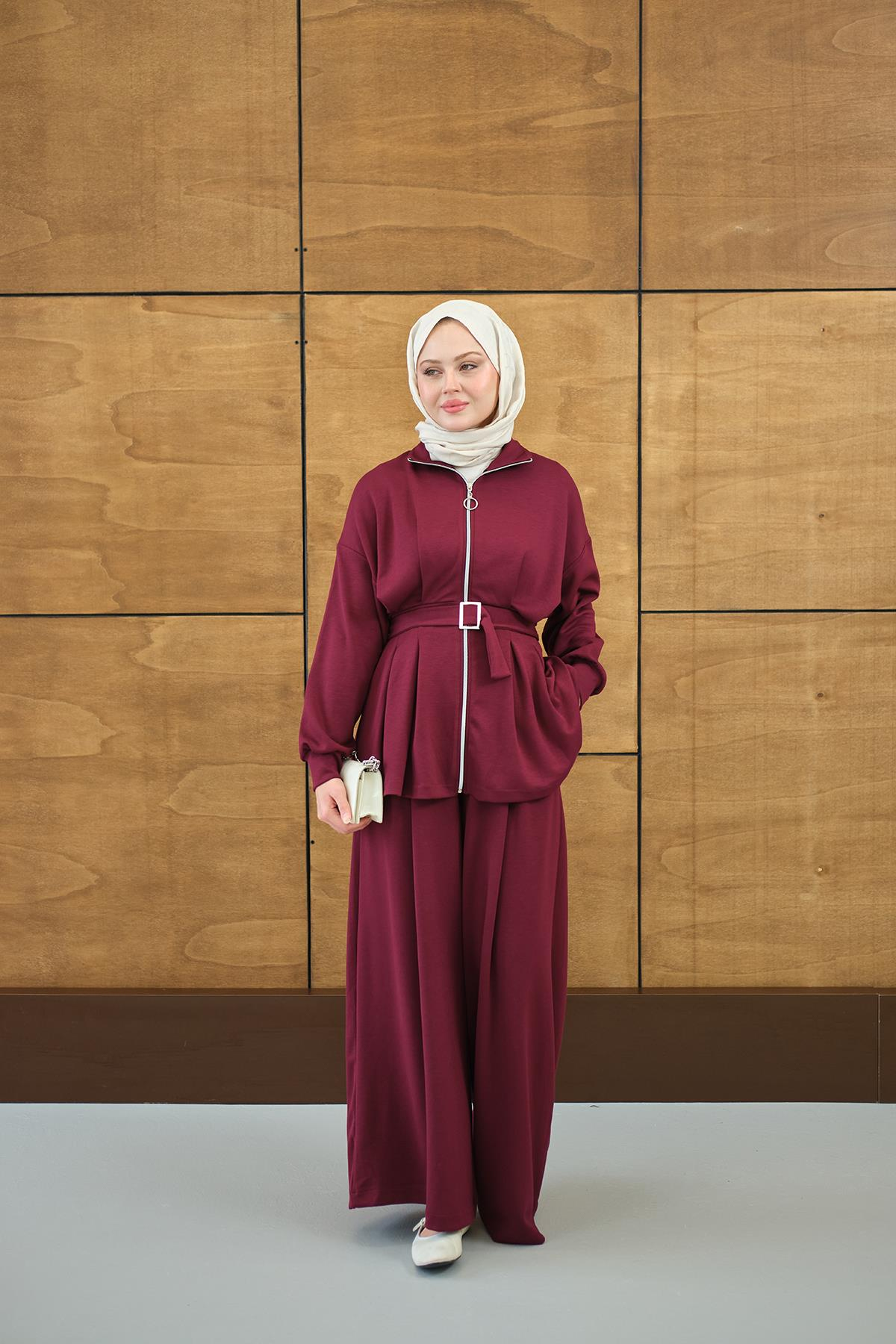 Pile Detaylı Tokalı Takım Mürdüm