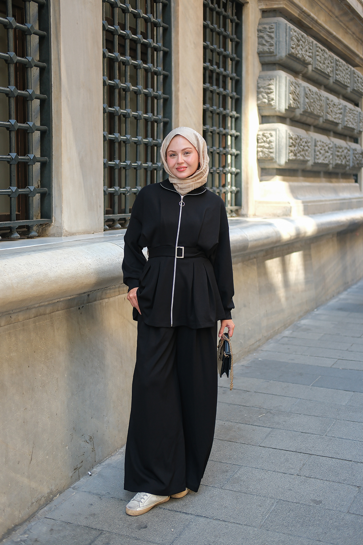Pile Detaylı Tokalı Takım Siyah
