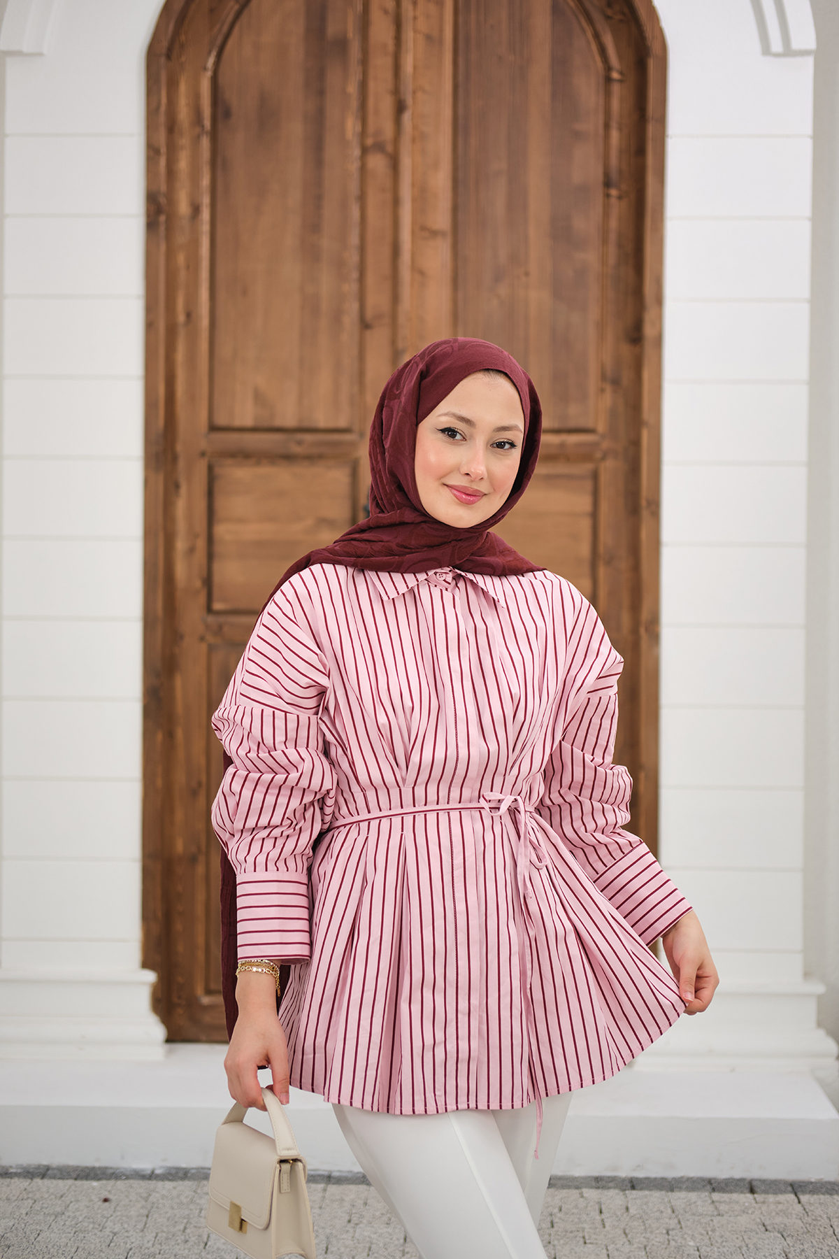 Pileli Gizli Düğmeli Çizgili Gömlek Pembe