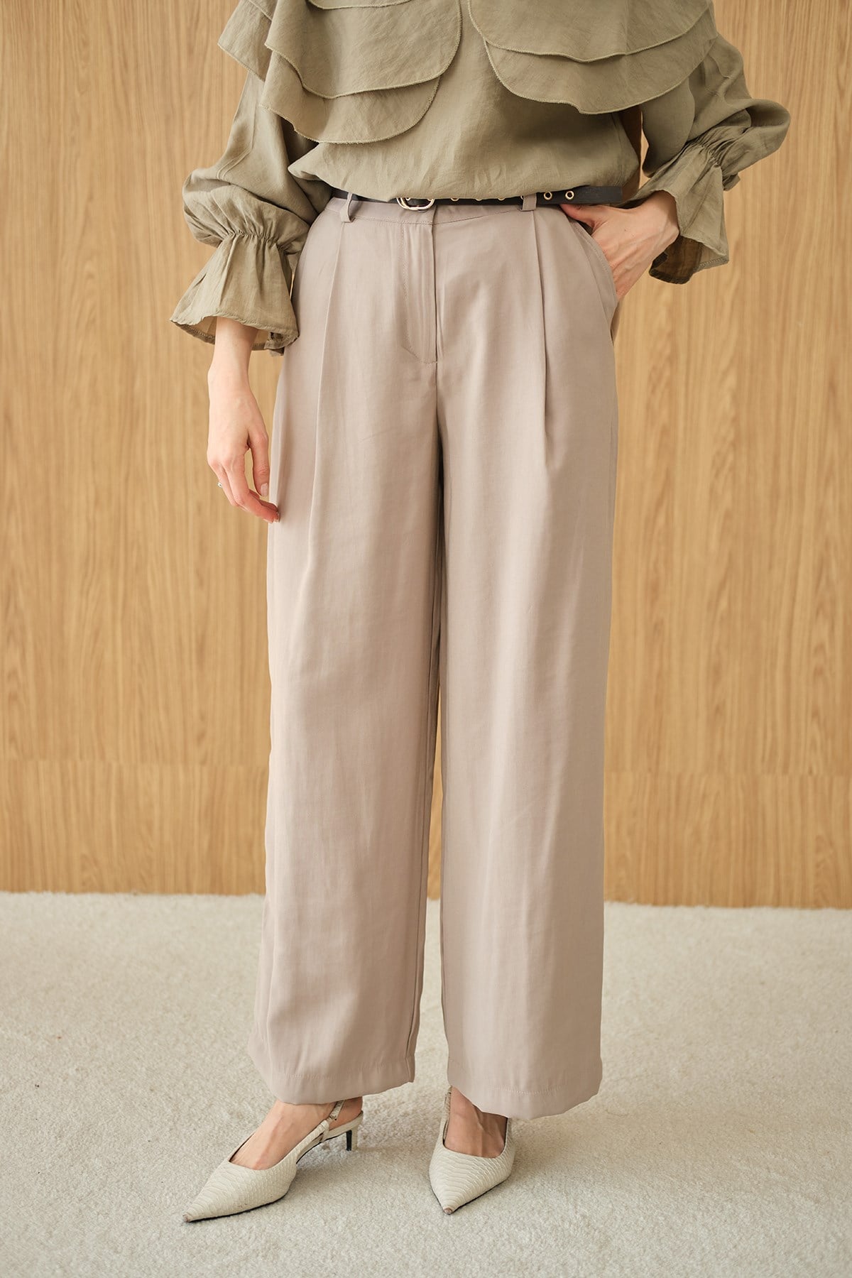 Pileli Kemerli Pantolon Krem