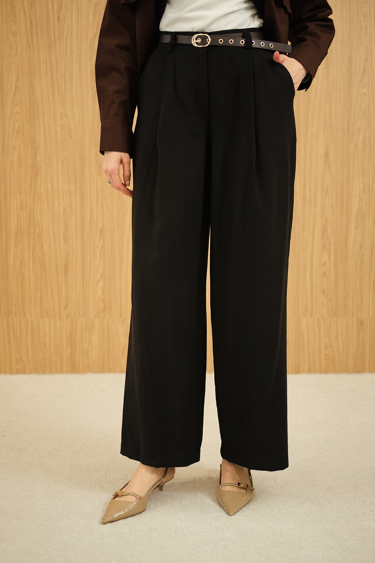 Pileli Kemerli Pantolon Siyah