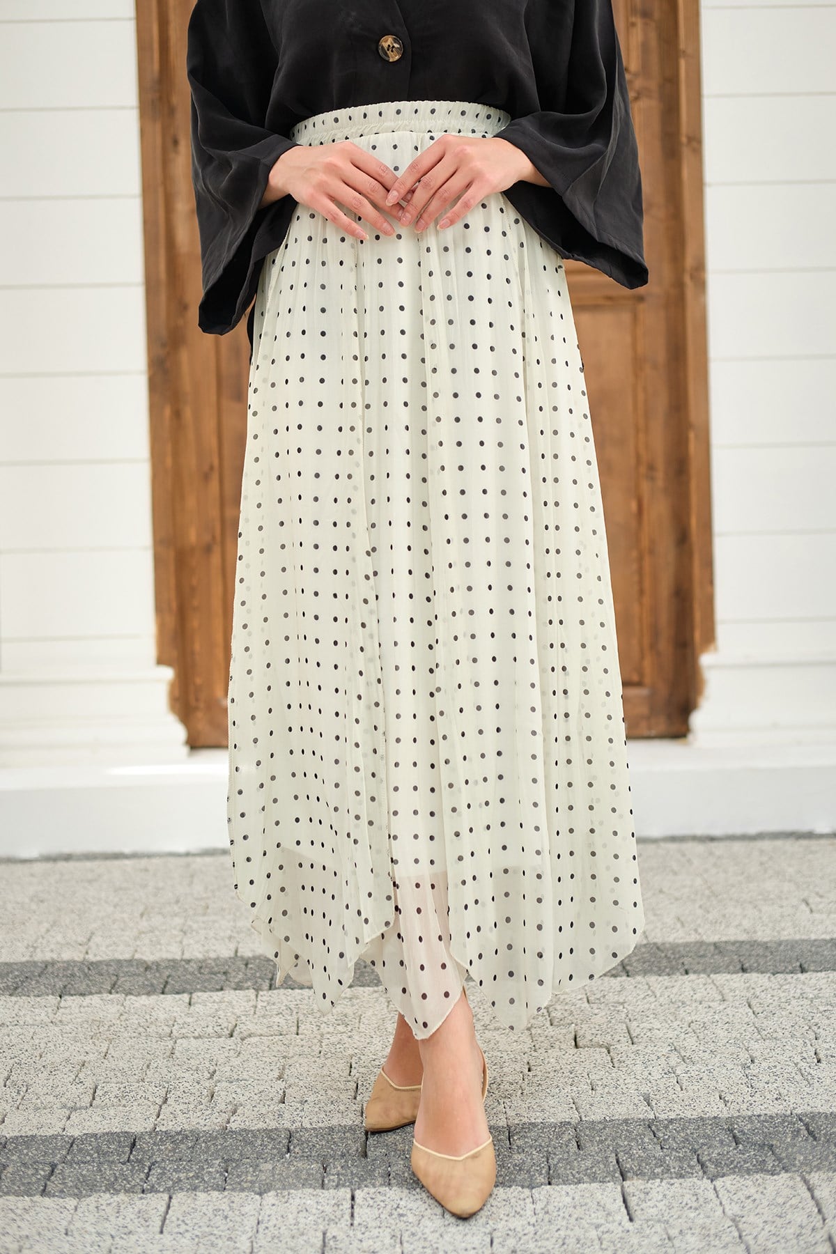 Puantiye Detay Yan Bağcık Şifon Etek Beyaz