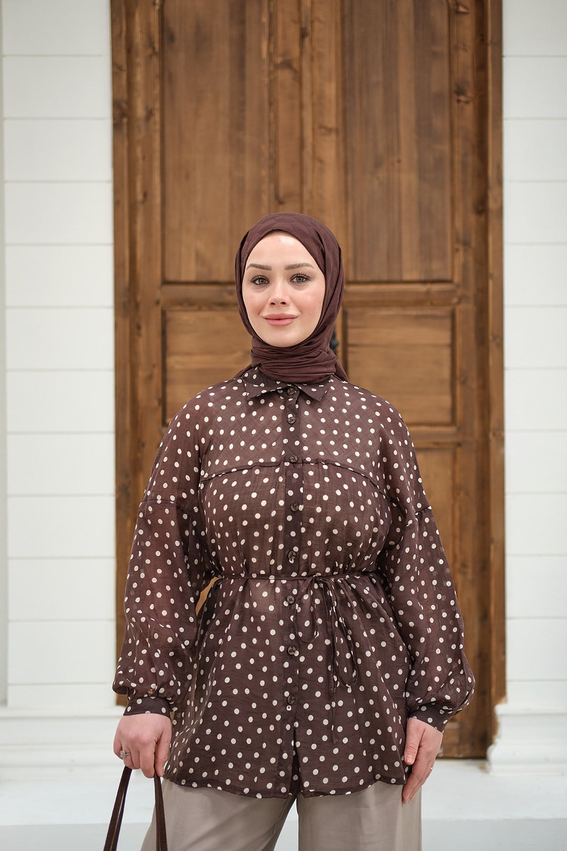 Puantiyeli Tül Detay Bel Bağlamalı Gömlek Kahverengi