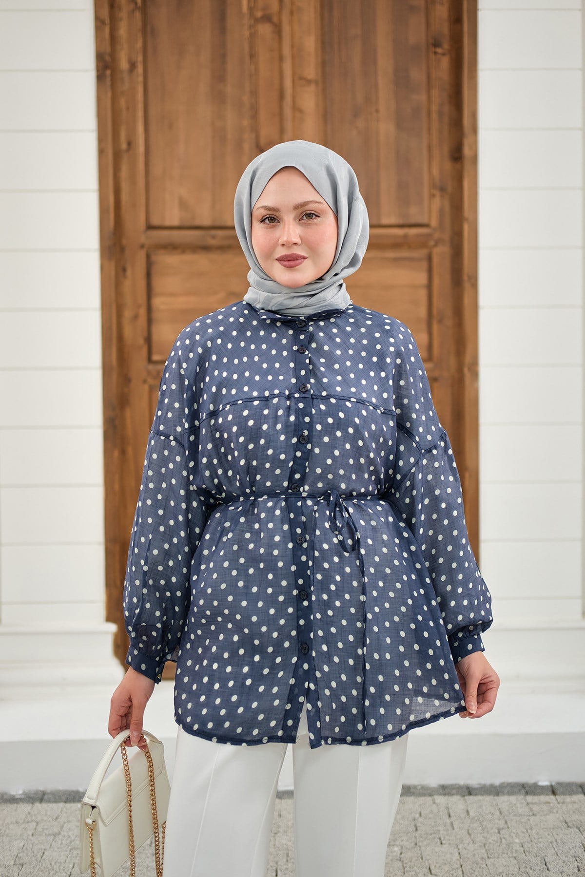 Puantiyeli Tül Detay Bel Bağlamalı Gömlek Mavi