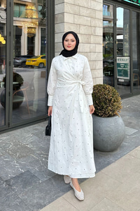 Puantiyeli Yandan Bağlamalı Elbise Beyaz