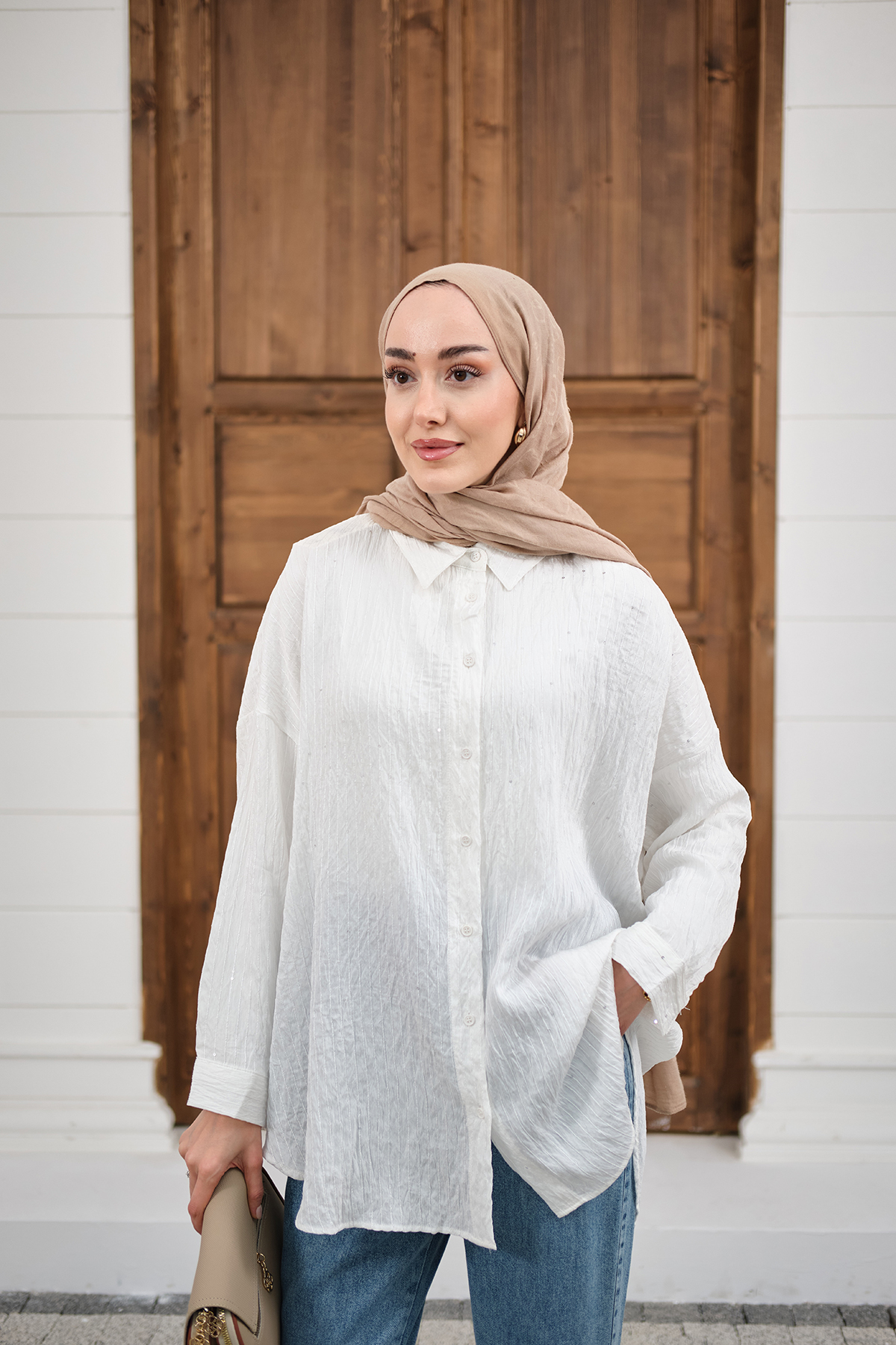 Pul Detaylı Kendinden Desen Gömlek Beyaz