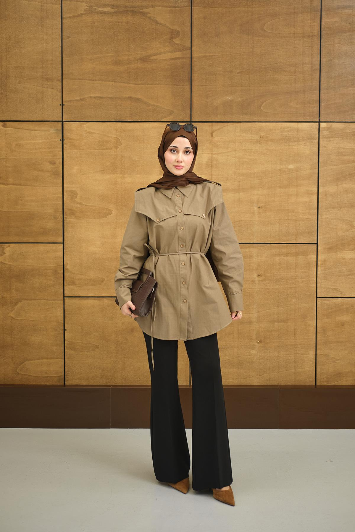 Roba Detaylı Kemerli Regular Poplin Gömlek Kahverengi