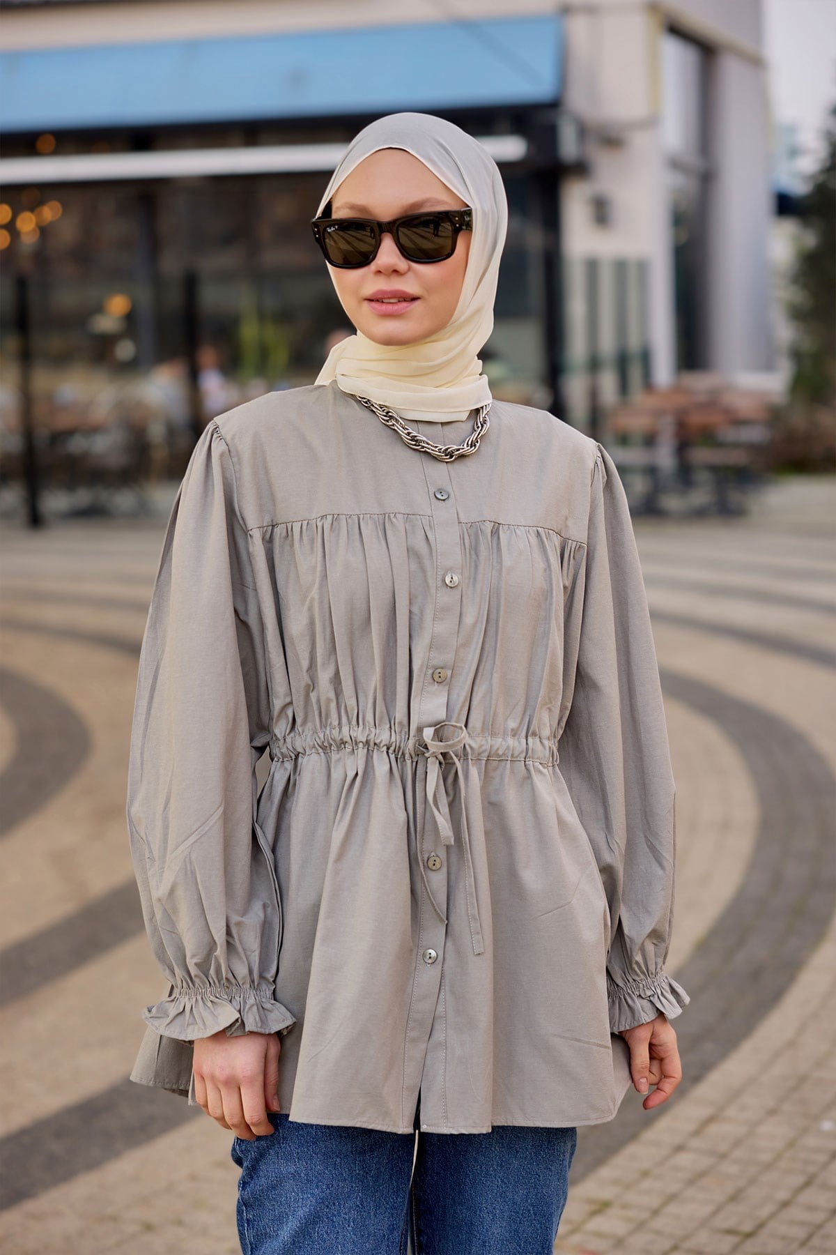 Robadan Büzgü Detaylı Balon Kol Gömlek Küf Yeşil
