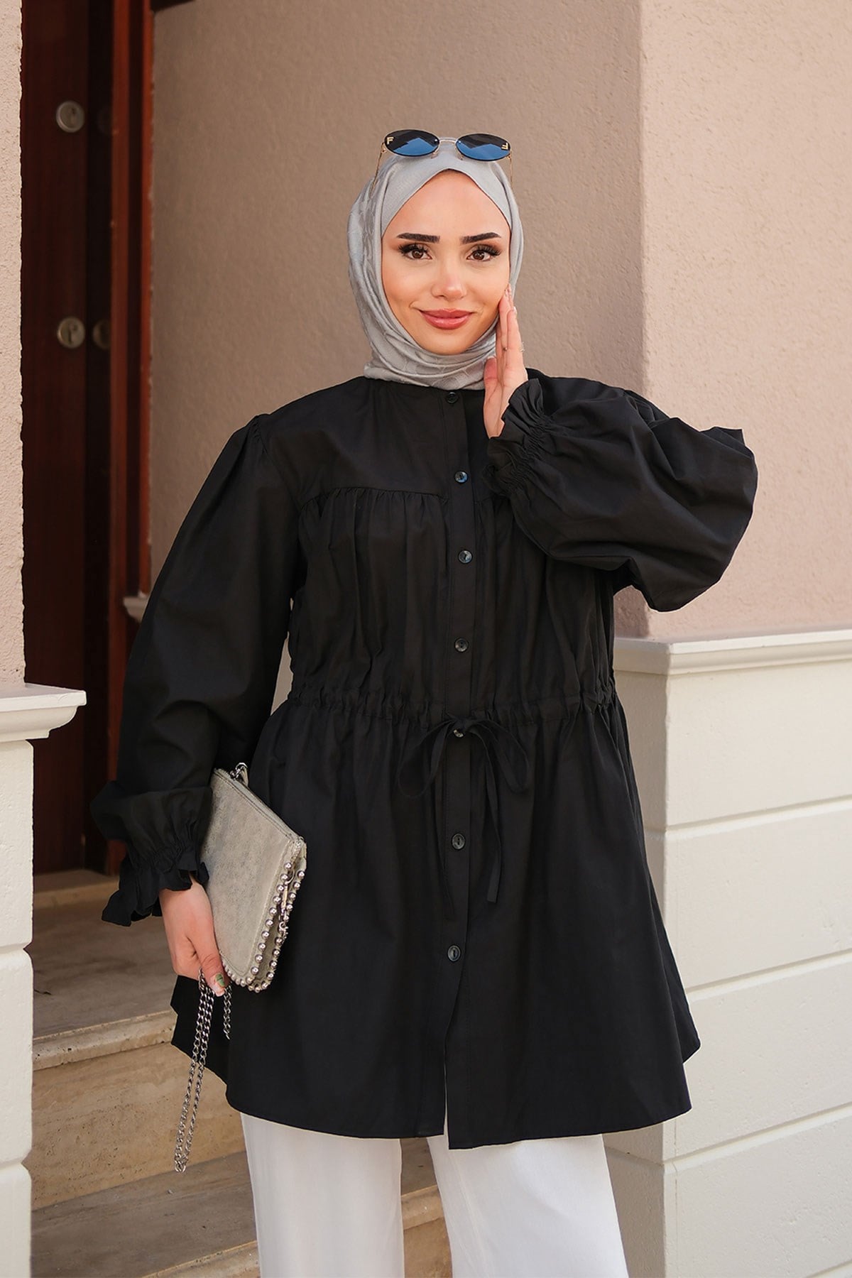 Robadan Büzgü Detaylı Balon Kol Gömlek Siyah