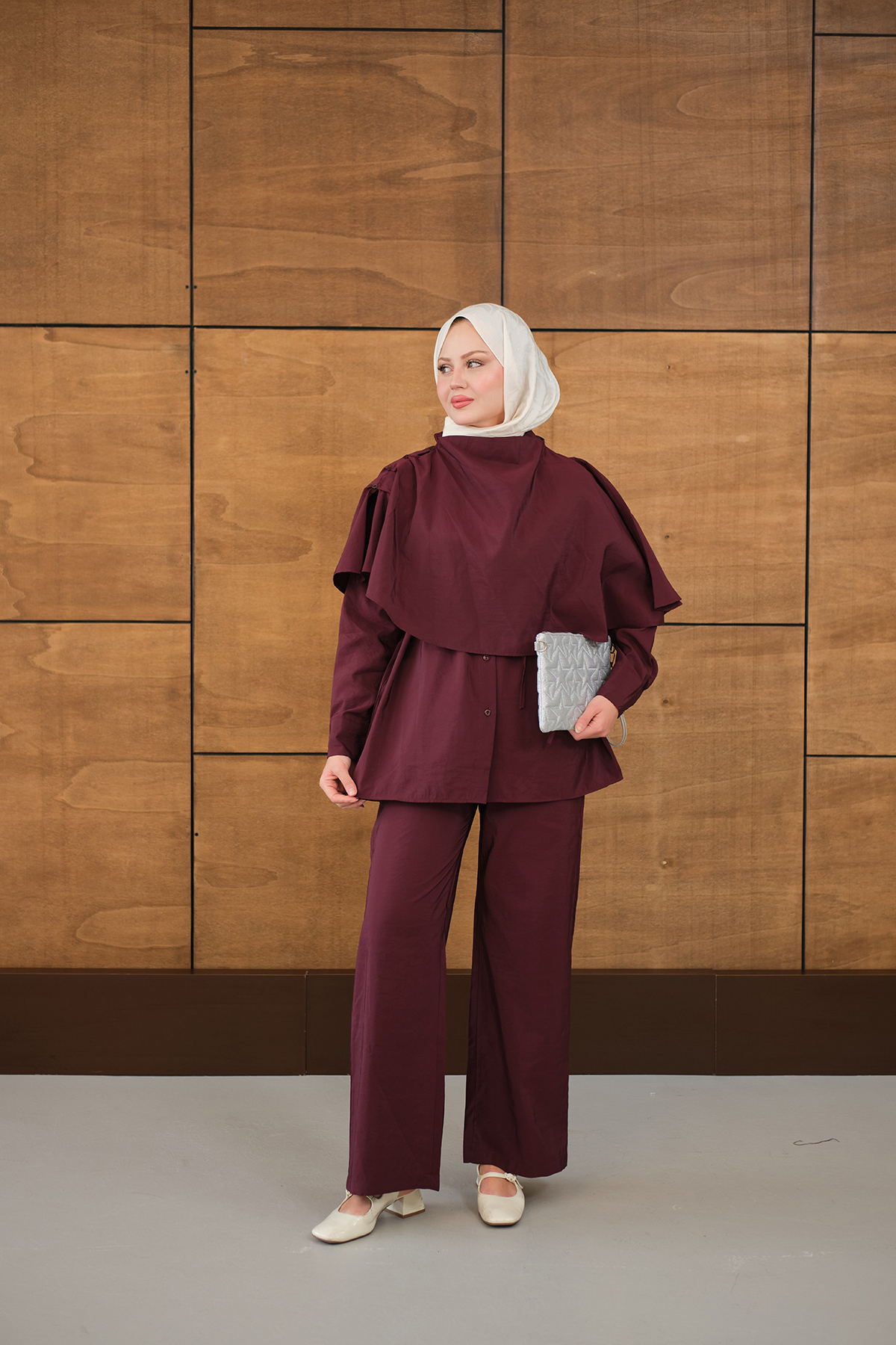 Şal Detay Bel Bağlamalı Gömlekli Takım Bordo