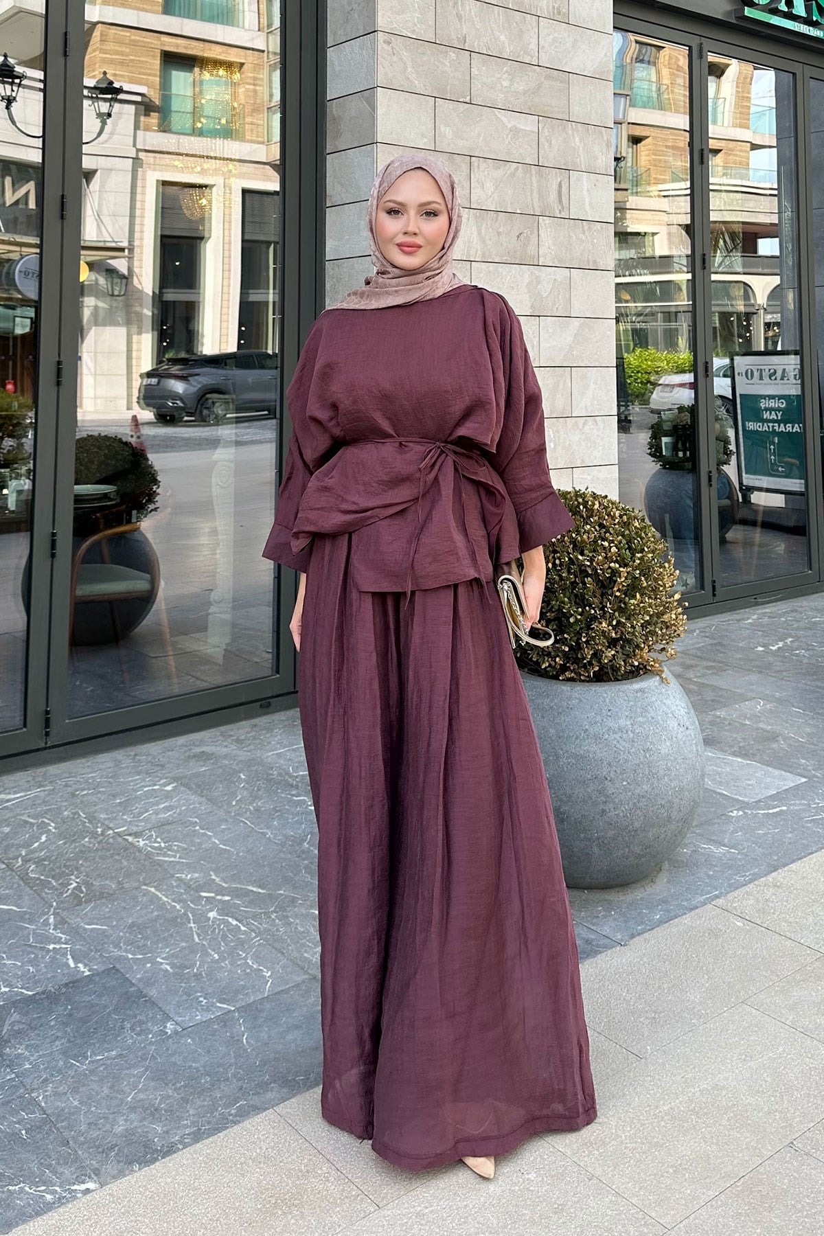Şal Detay Pantolonlu Bel Bağlamalı Takım Bordo