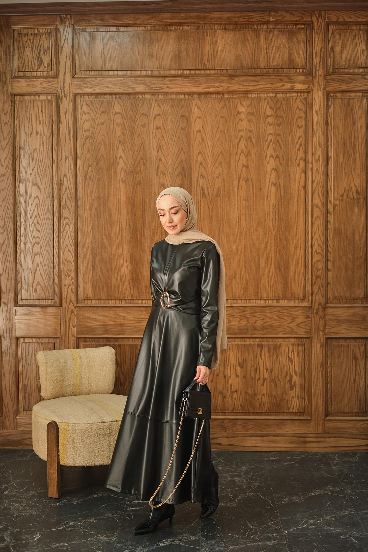 Minimal detaylarla zenginleştirilmiş bu siyah deri elbise, hem ofiste hem de akşam organizasyonlarında stilinizi tamamlar. Cep detayı bulunmayan temiz formu, topuklu ayakkabılar veya sade sneaker’lar ile rahatça kombinlenebilir. Sezon trendlerine uygun bu parça, tesettür elbise modelleri arasında şık bir alternatif sunuyor.