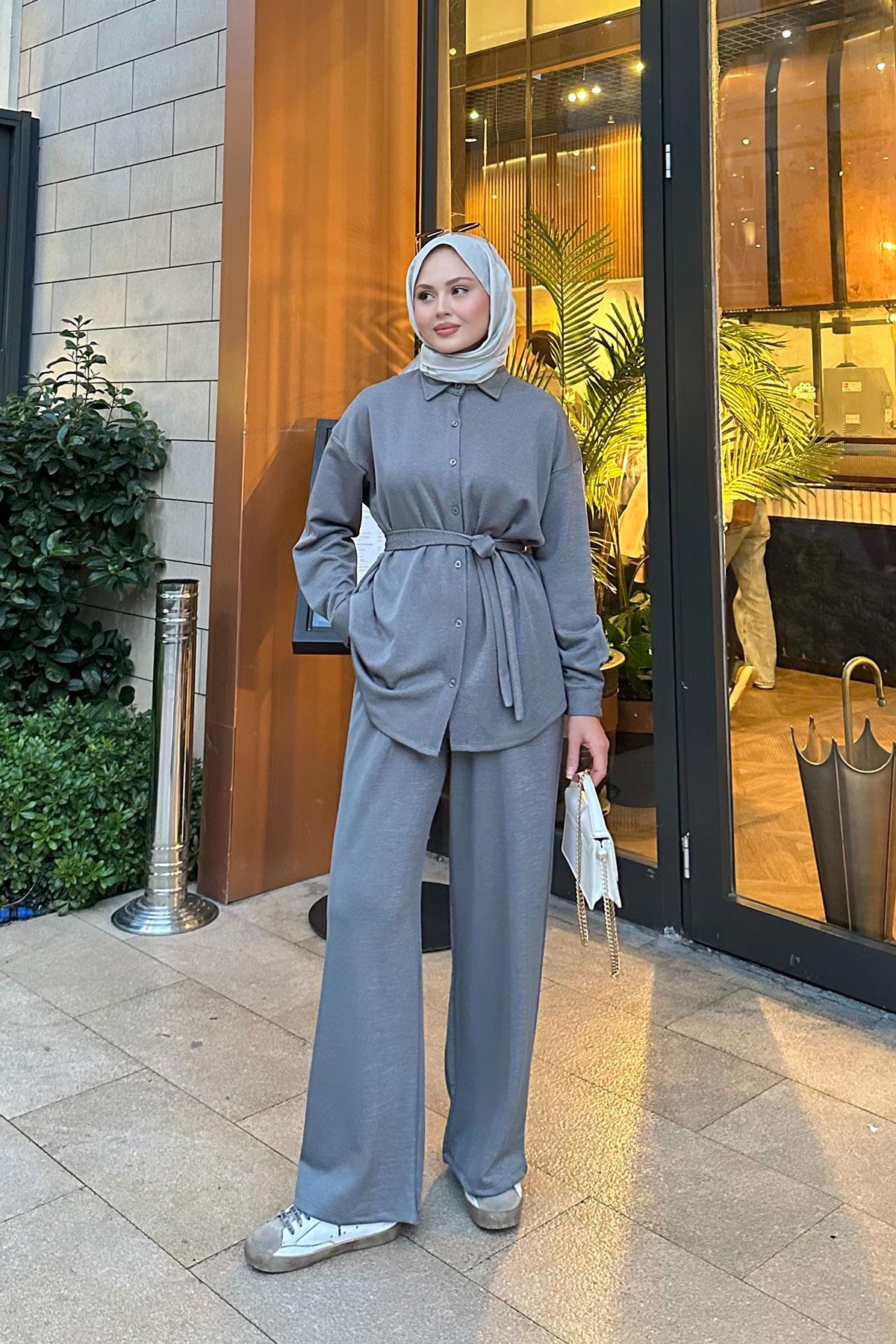 Sim Detay Bel Bağlamalı Takım Gri