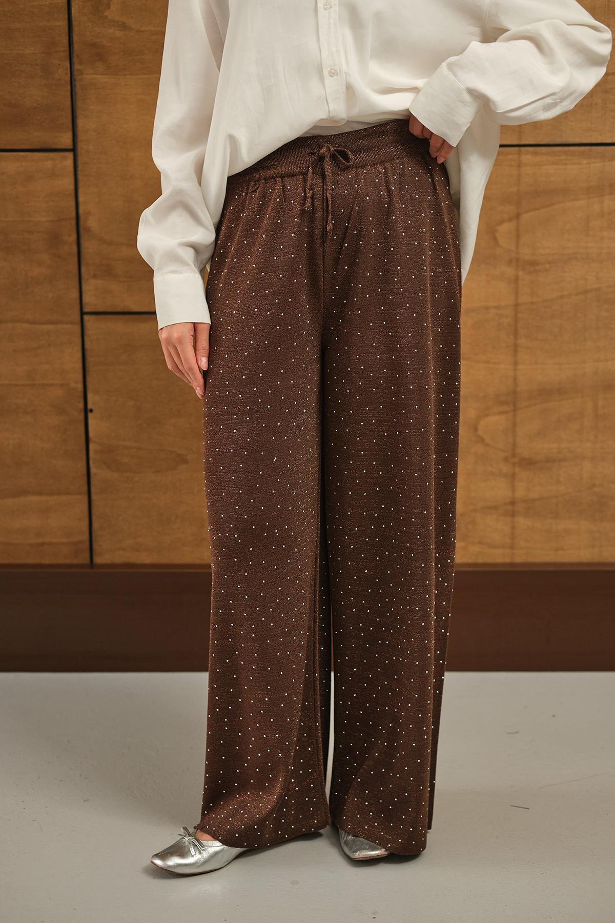 Sim Detay Taşlı Triko Pantolon Kahverengi
