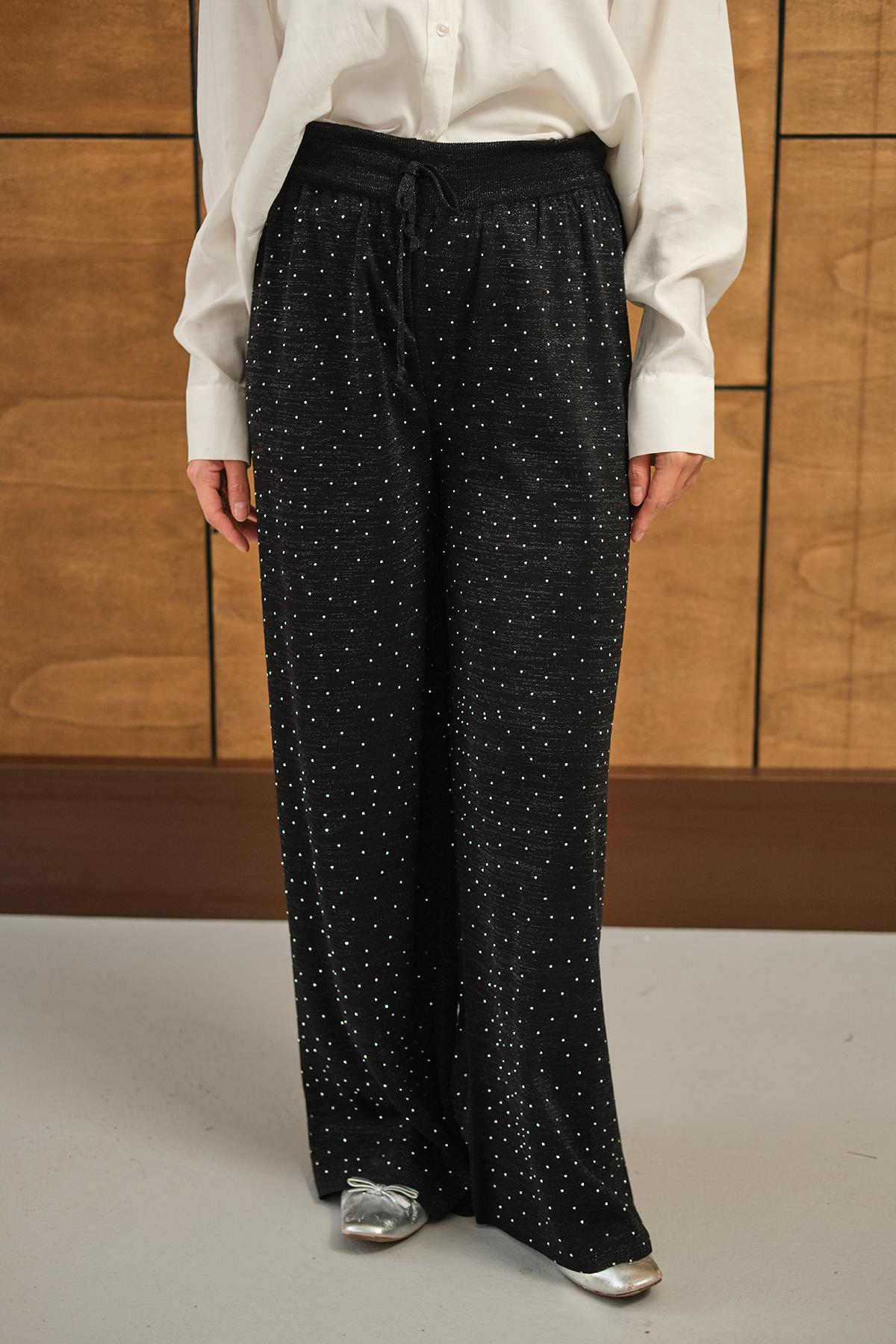 Sim Detay Taşlı Triko Pantolon Siyah