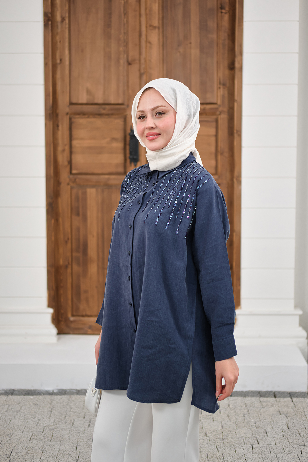 Sıralı Boncuk İşlemeli Gömlek Lacivert