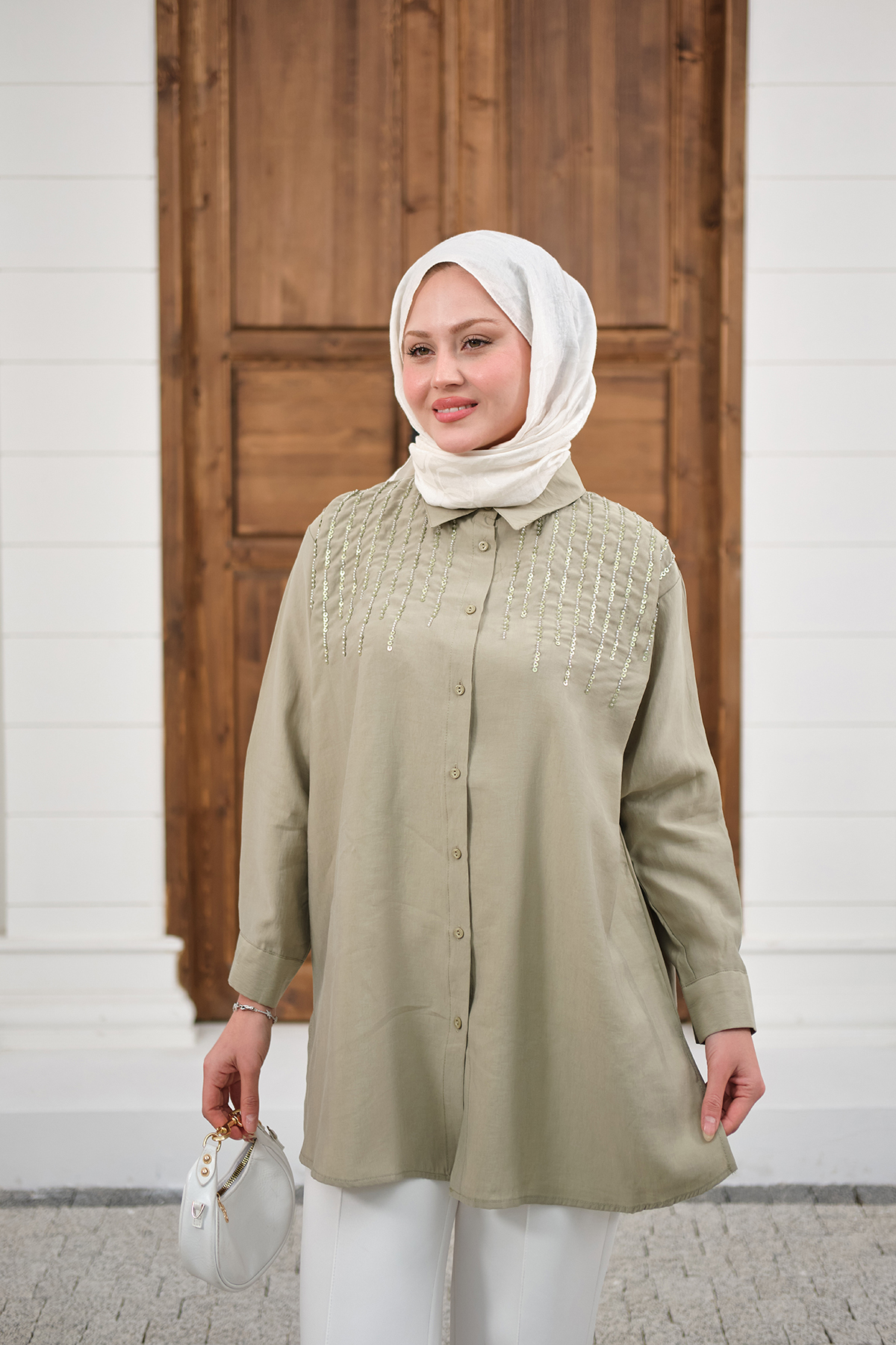 Sıralı Boncuk İşlemeli Gömlek Yağ Yeşil