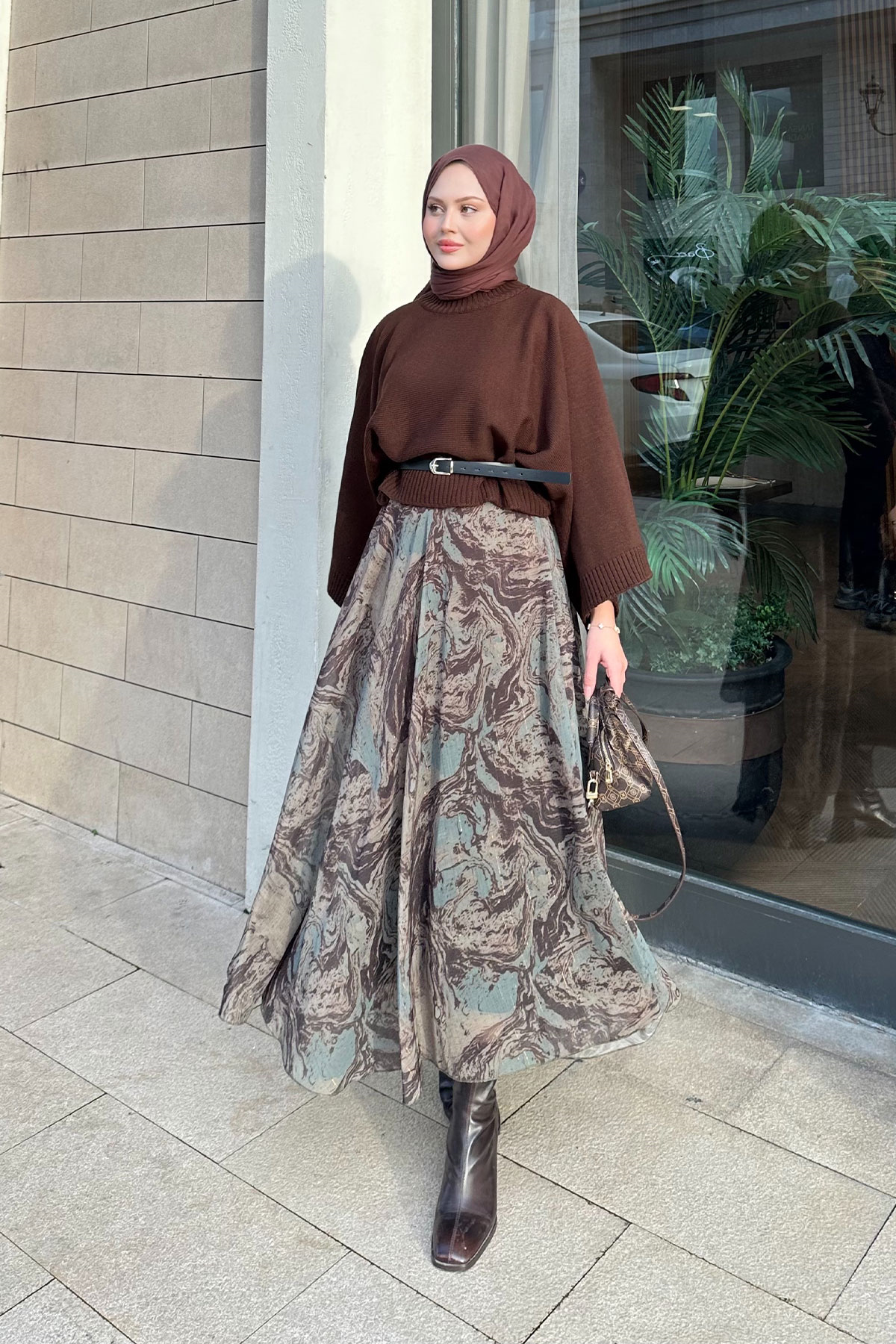 Soyut Desenli Sim Detay Kemerli Etek Haki Yeşil