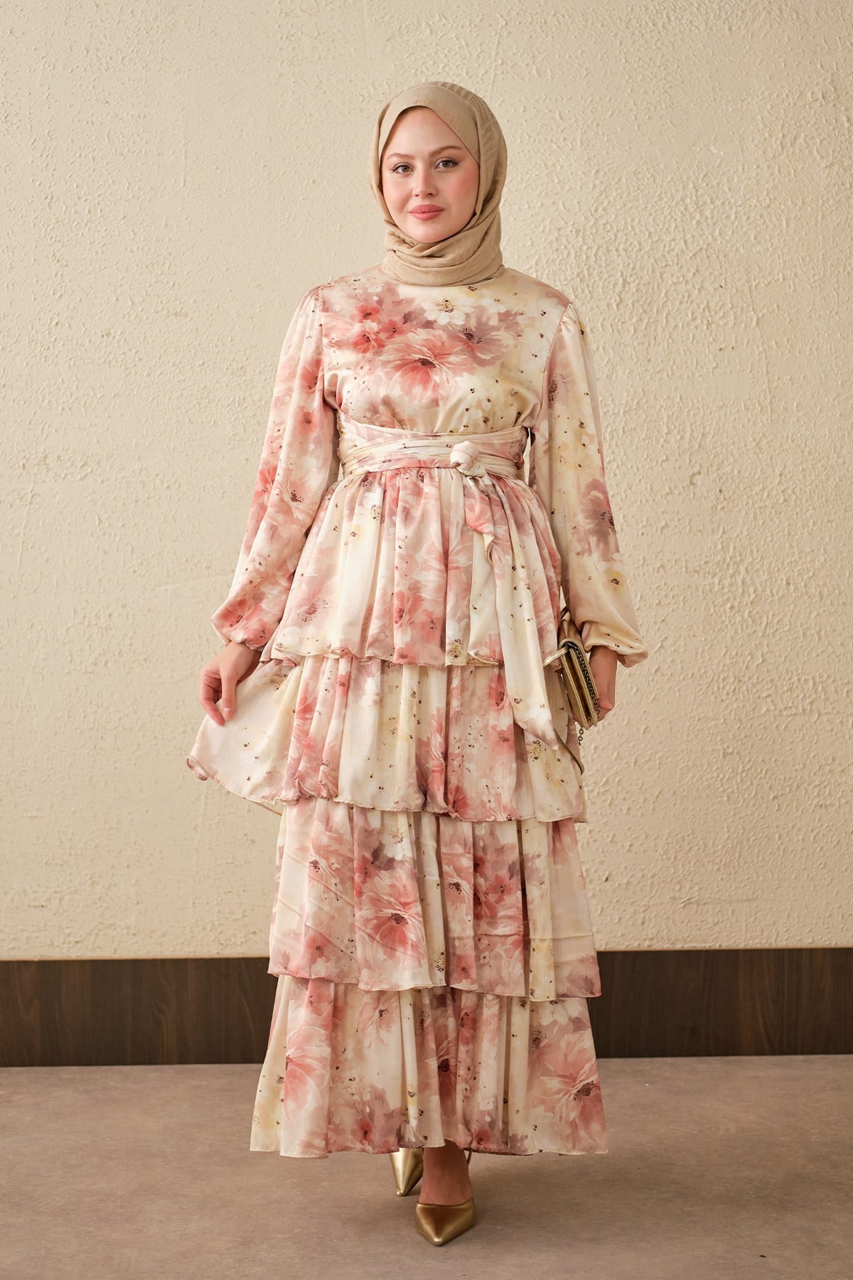 Sulu Boya Çiçek Desen Saten Elbise Somon
