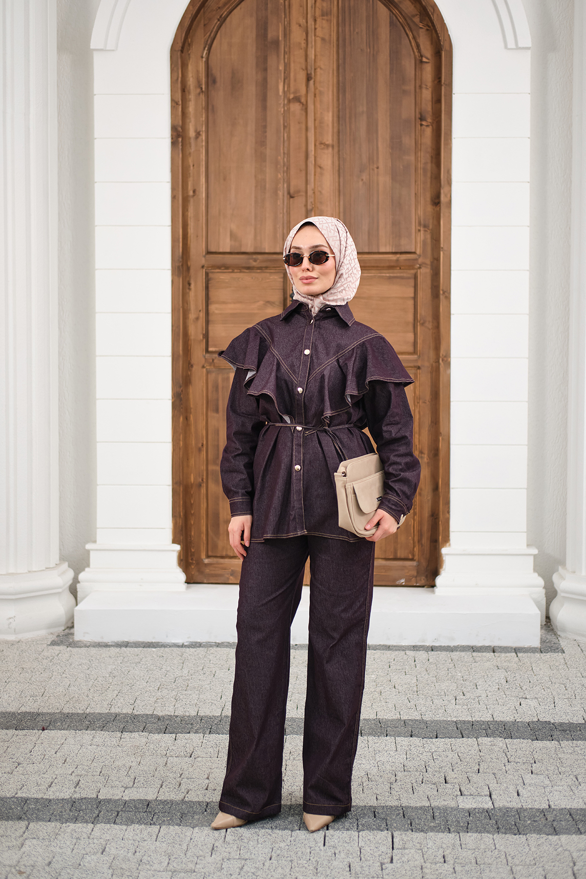 Süs Dikiş Detaylı Omuzları Fırfırlı Pantolonlu Kot Takım Mor