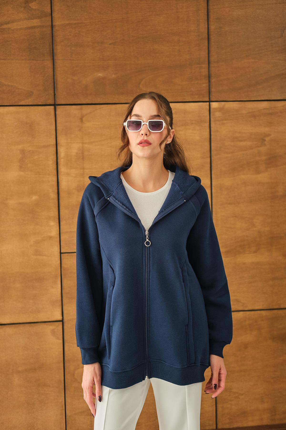 Süveter Detay Kapüşonlu Hırka Lacivert