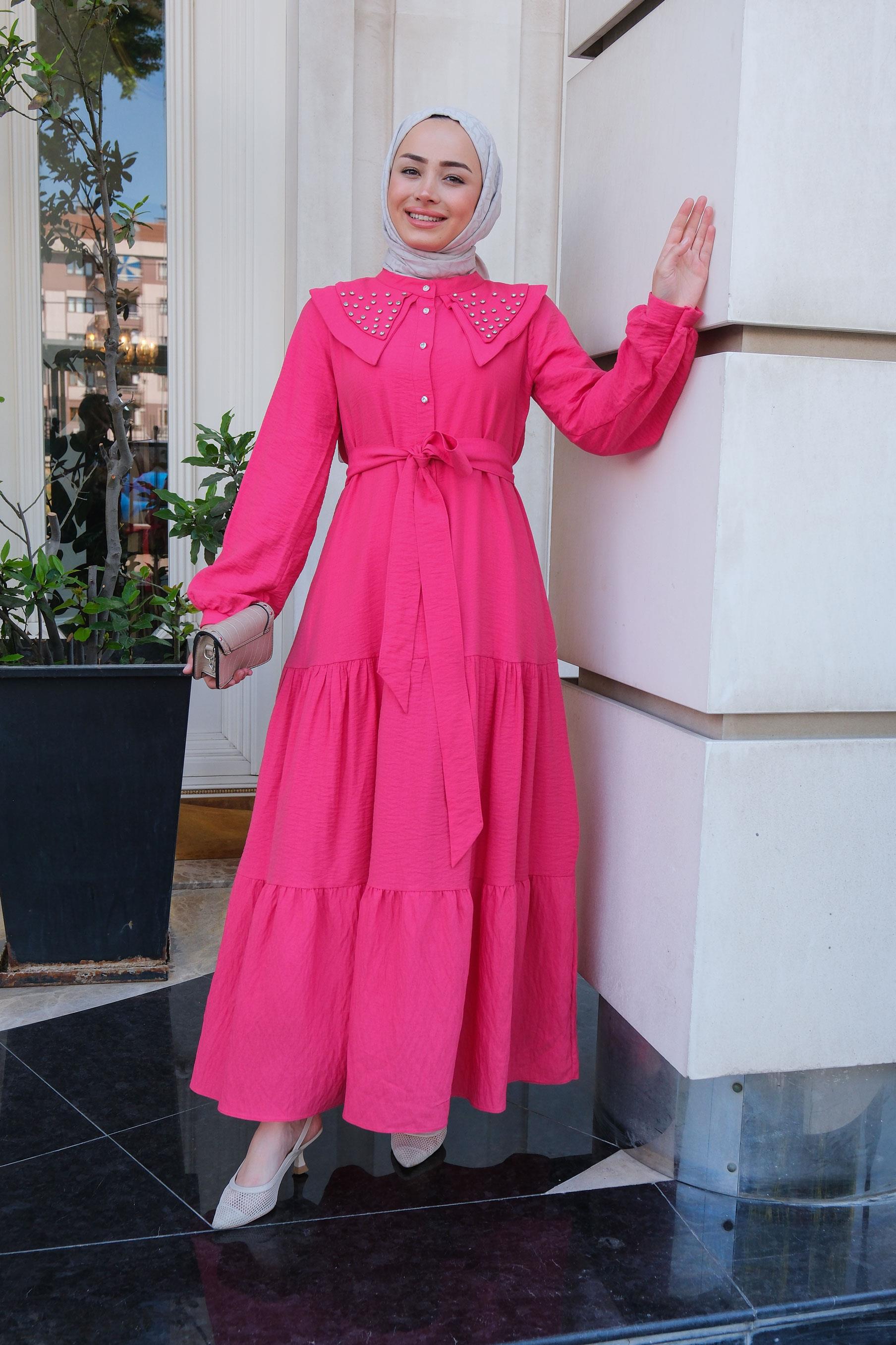 Taş Detay Bebe Yaka Bağlamalı Elbise Fuşya
