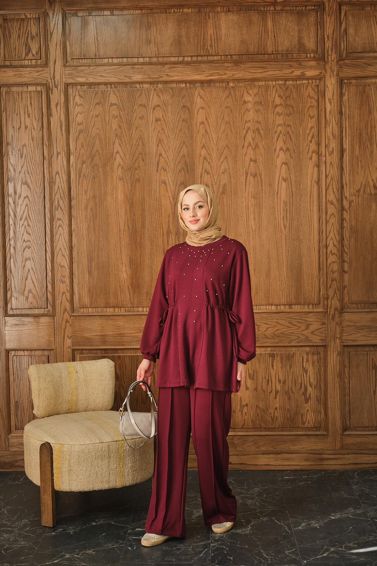 Taş Detay İkili Takım Bordo
