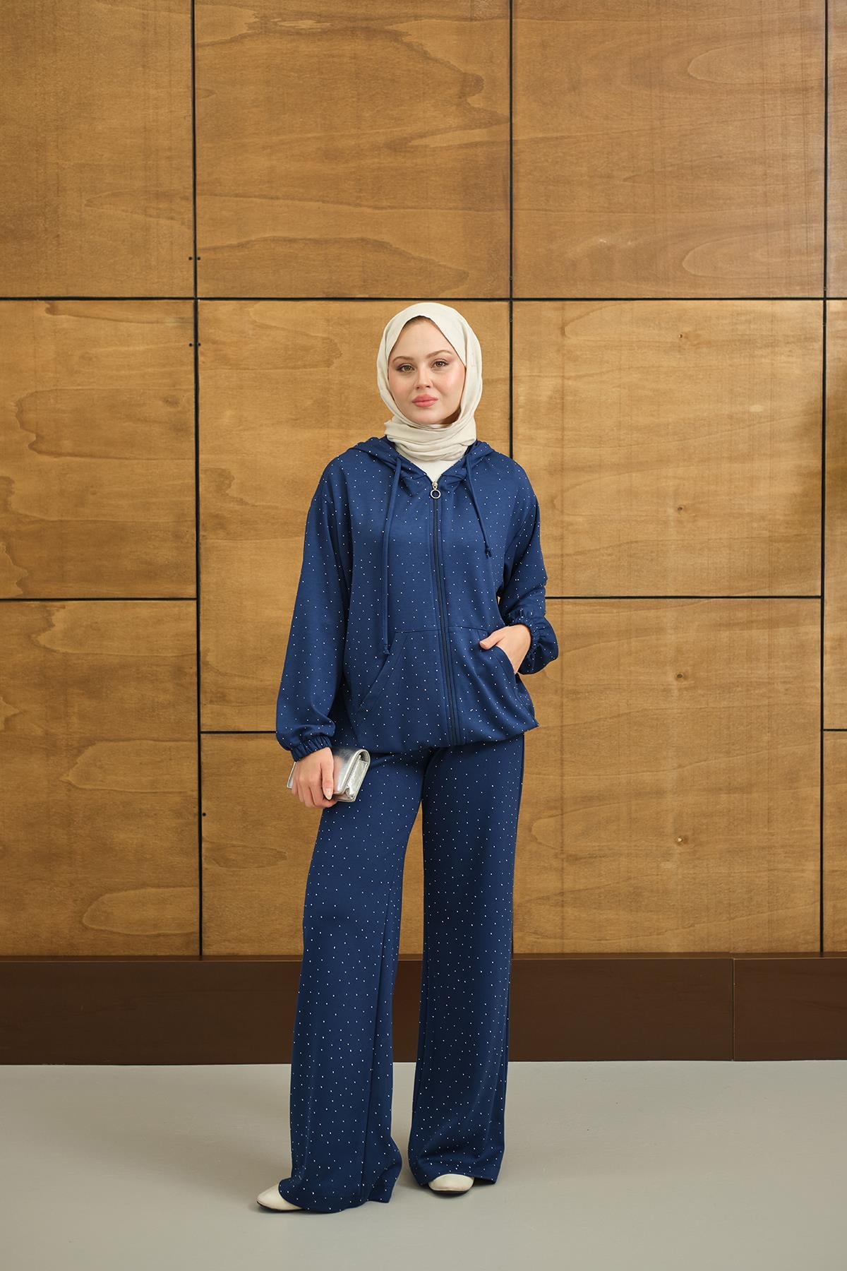Taş Detay Kapüşonlu İkili Takım Lacivert