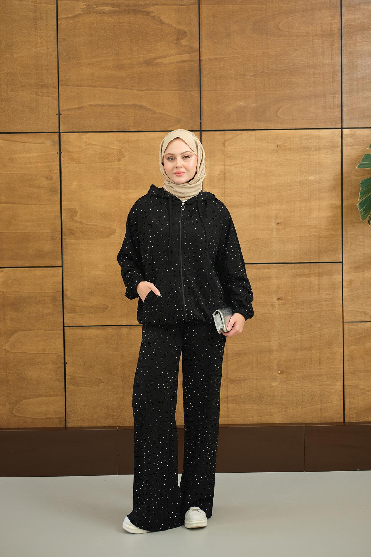 Taş Detay Kapüşonlu İkili Takım Siyah