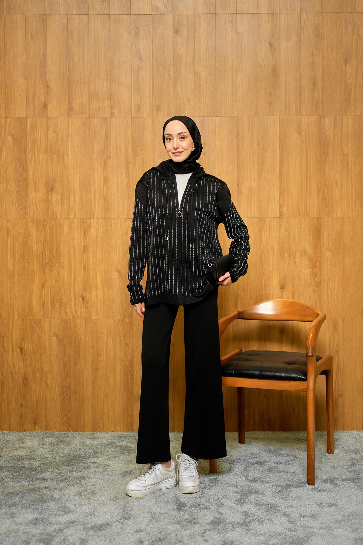 Taş Detay Triko Takım Siyah