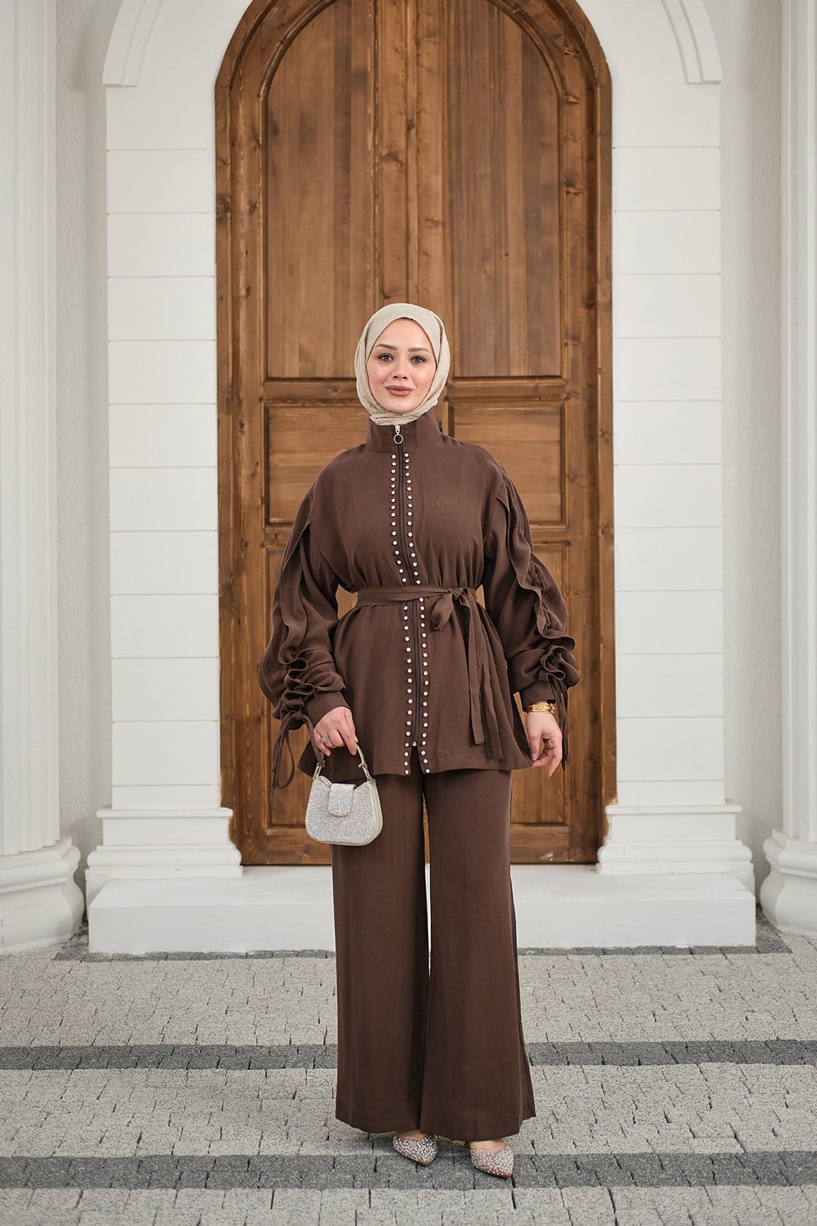 Taş İşlemeli Fermuarlı Bel Bağlamalı Takım Kahverengi